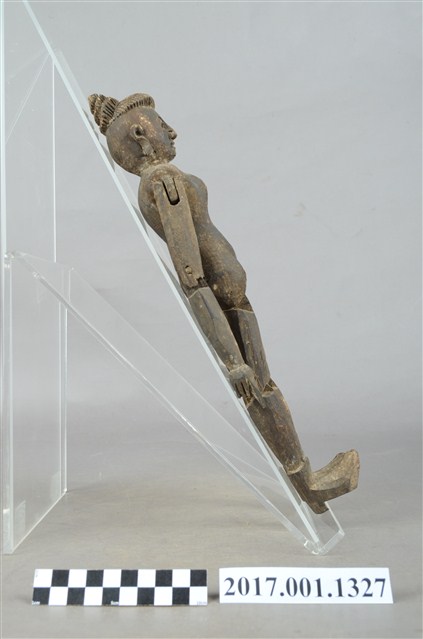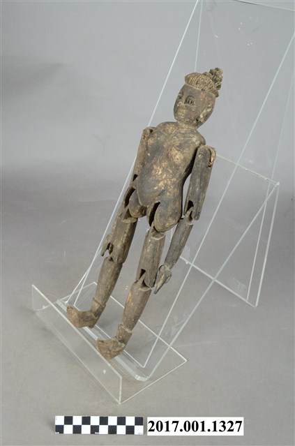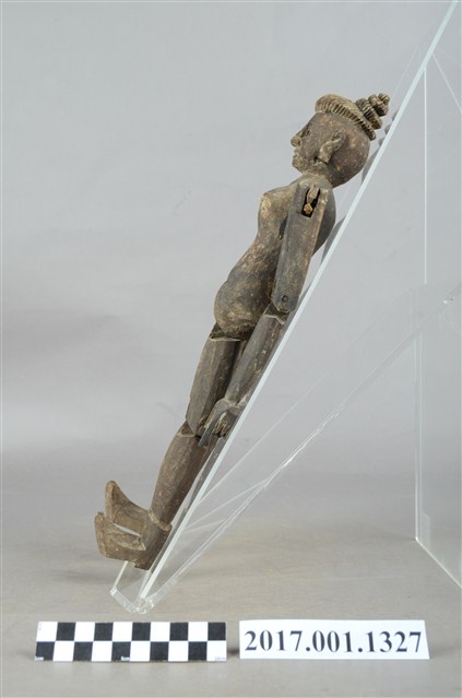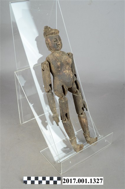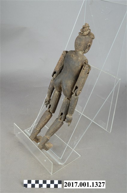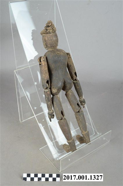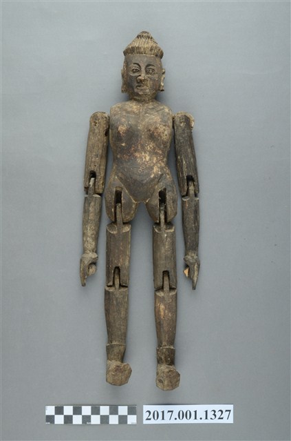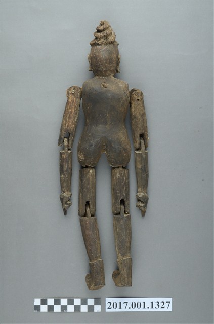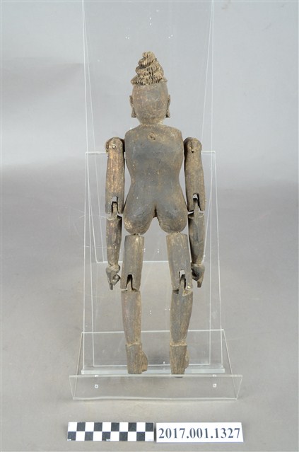 1.本件木雕軟身菩薩像,粧佛清除。造像屬於軟身神像,分為頭部與身軀、上手臂、下手臂與手掌、大腿、小腿與腳掌,共十個構件組裝而成,各部位以關節接合,四肢可活動。頭部雕鑿盤髮,身軀雕塑乳房。