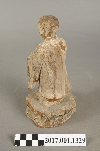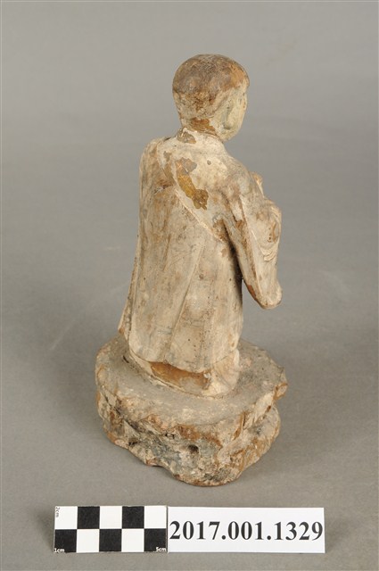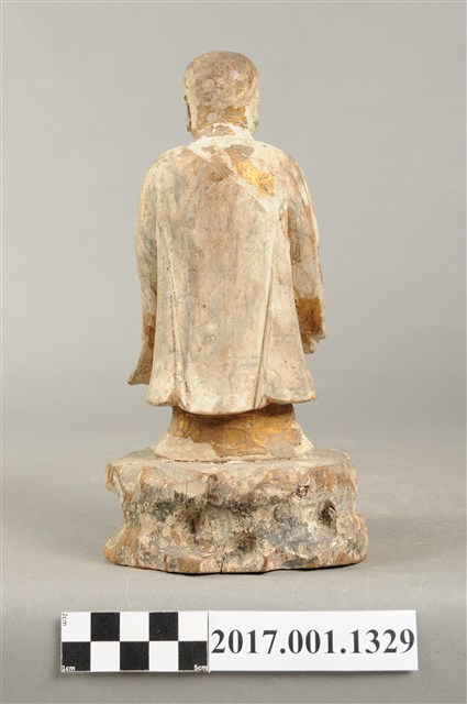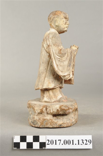 1.本件木雕迦葉尊者像,作站姿姿態,表面施作塗裝、安金不見紅粉線盤飾粧佛技法,局部粧佛剝落,剝落處可見墨線打稿。顏面表現年老比丘相貌,身著右衽寬袖僧袍、胸臆前綴有袈裟環釦,袈裟粉線盤飾方格福田衣紋。立像挺身站於岩座上,雙手作揖置於胸前。