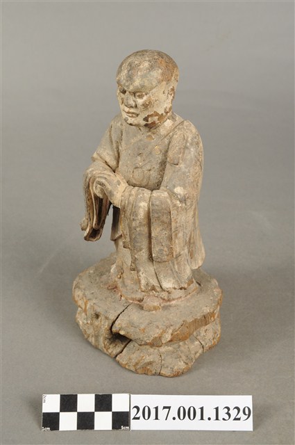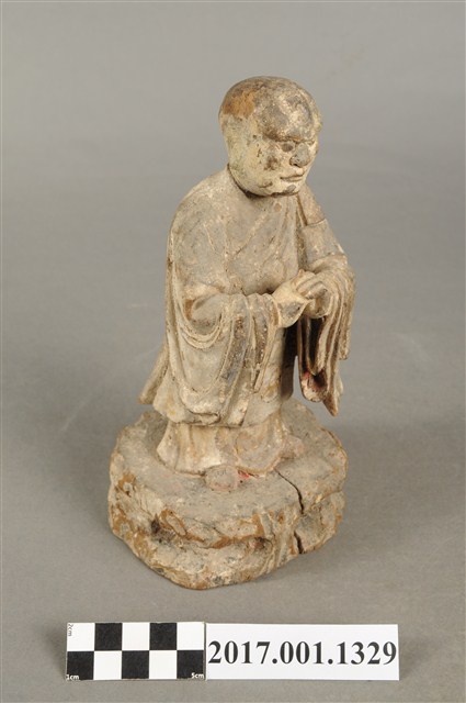 2.迦葉尊者或做摩訶迦葉,是梵語音譯摩訶迦葉波的簡稱,佛典或稱大迦葉,為釋迦牟尼佛的十大弟子,並以頭陀第一著稱,釋迦牟尼佛涅槃後成為僧團領袖,並在王舍城召集僧眾進行第一次結集。迦葉尊者最著名的事蹟是「拈花微笑」,被尊為禪宗初祖,漢傳佛教受禪宗的影響而將迦葉、阿難尊者作為釋迦牟尼佛的脅侍。迦葉尊者的造像,依據經典的內容表現成年老比丘相,明代成書的《佛祖道影》描繪迦葉尊者為老者、雙手作揖,立像配置於釋迦牟尼佛坐像旁。(富俐崴文化事業有限公司/謝宗榮計畫主持)
