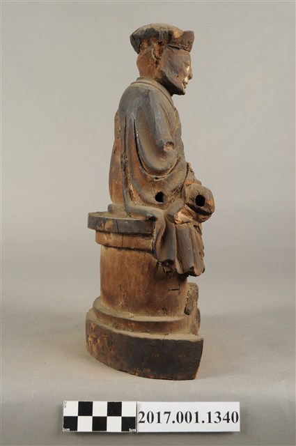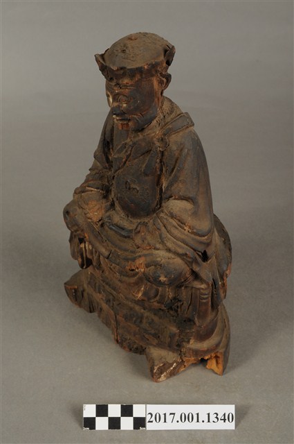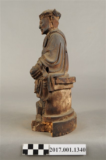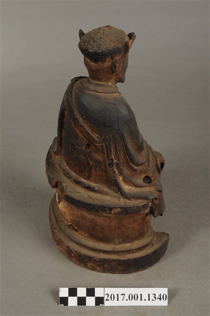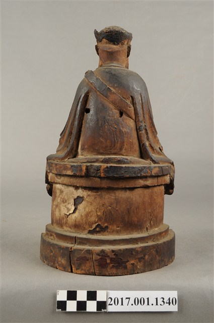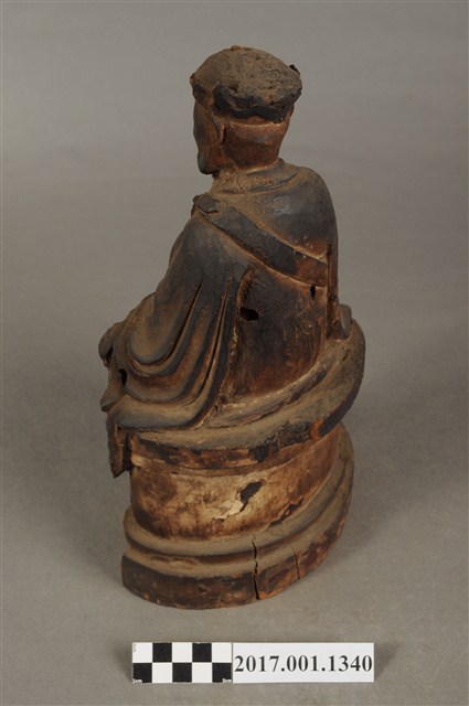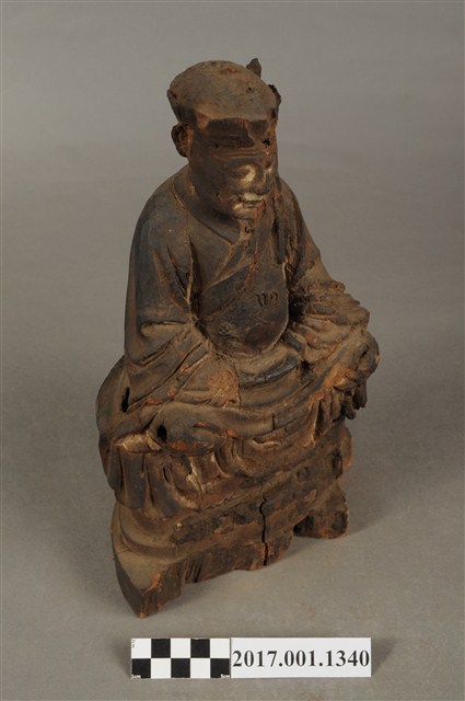 1.本件木雕清水祖師像,作結跏趺坐姿態,坐於臺座上,表面施作塗裝粧佛技法,神像腹前尚存部分粉線盤飾。頭戴毘盧冠,顏面表現額頭三道抬頭紋,雙眼垂視,形成老僧面容,身著右衽寬袖僧袍、左肩綴有袈裟環釦。雙足盤腿,雙掌相疊成禪定印置於腹前。
