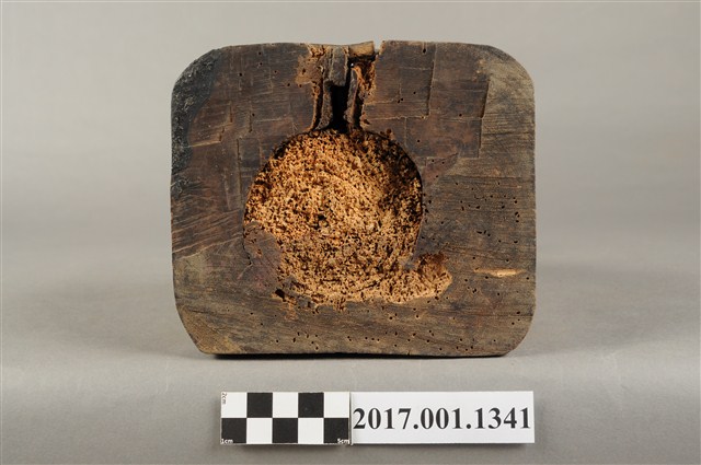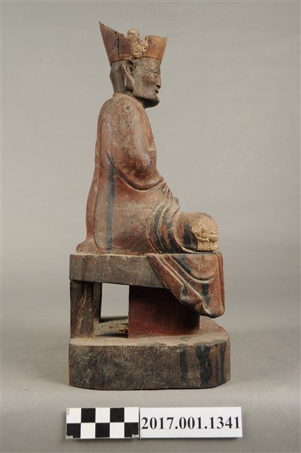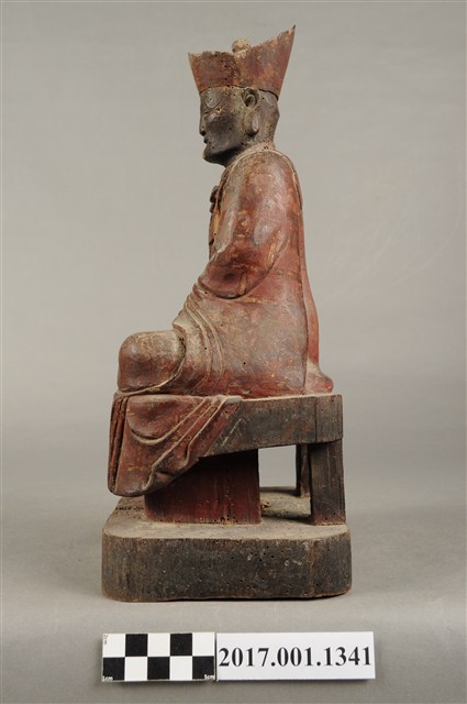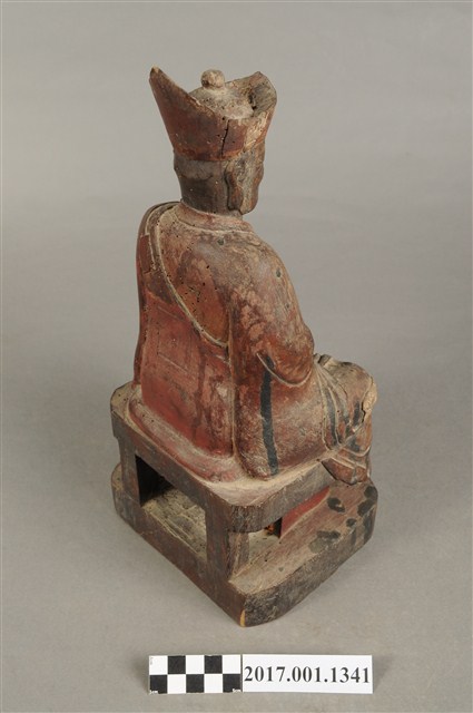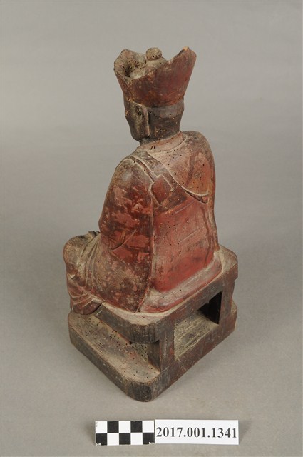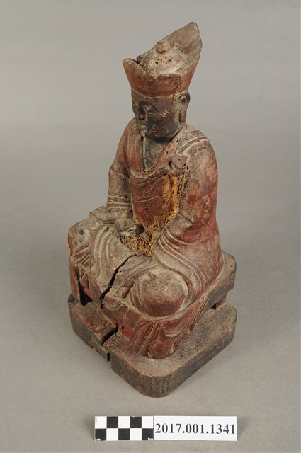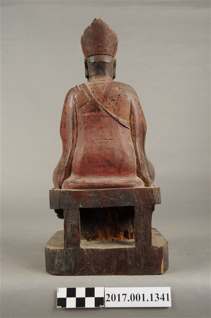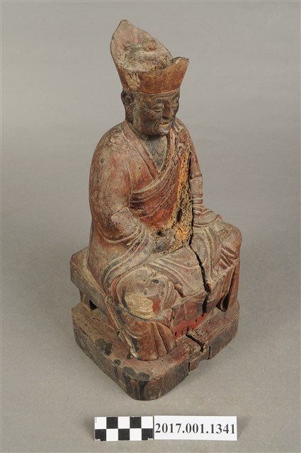 1.本件木雕清水祖師像,作結跏趺坐姿態,表面施作塗裝粧佛技法,粧佛剝落嚴重,僅存部分粉線盤飾,正面下半部以兩個銀錠榫避免神像裂開,背面開有方形入神洞,封榫尚存。頭戴毘盧冠,額頭三道抬頭紋,雙眼垂視,形成老僧面容,身著右衽寬袖僧袍、左肩綴有袈裟環釦。雙足盤腿,雙掌相疊成禪定印置於腹前。