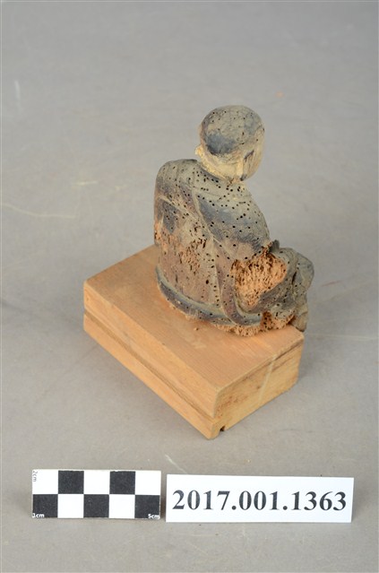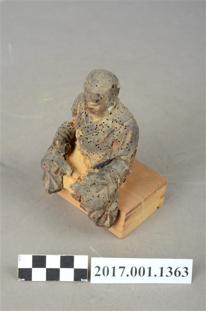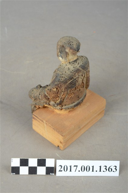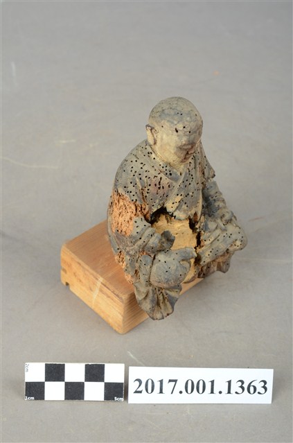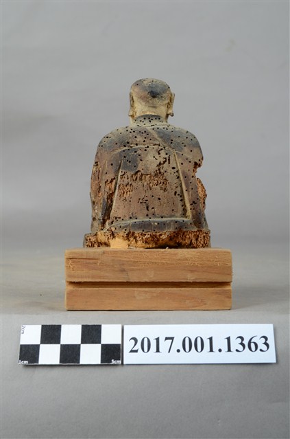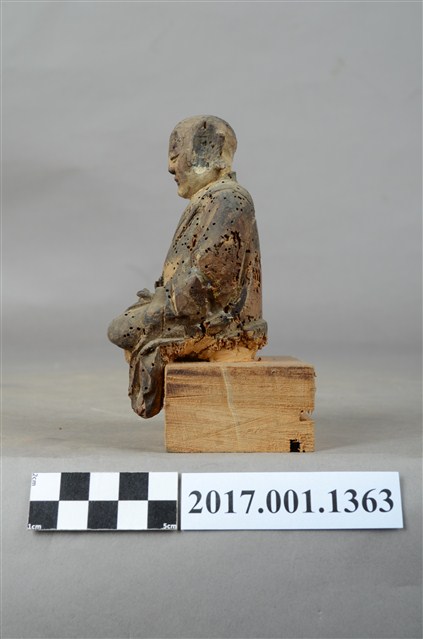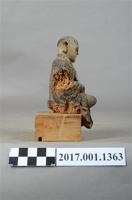 1.本件木雕普庵祖師像,作結跏趺坐姿態,表面蛀蝕嚴重。顏面表現青年比丘相貌,雙眼垂視,山根塌、鼻樑短,身著右衽寬袖僧袍、左肩綴有袈裟環釦。雙足盤腿,左手向上伸食指與小指收三指置於左膝,此種契印又稱「期克印」或「道指」,右手蛀蝕而不易辨別。本件屬於「脫椅」作法。本件判斷為普庵祖師,除相貌體態外,在與雙手手勢、持物。