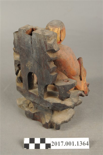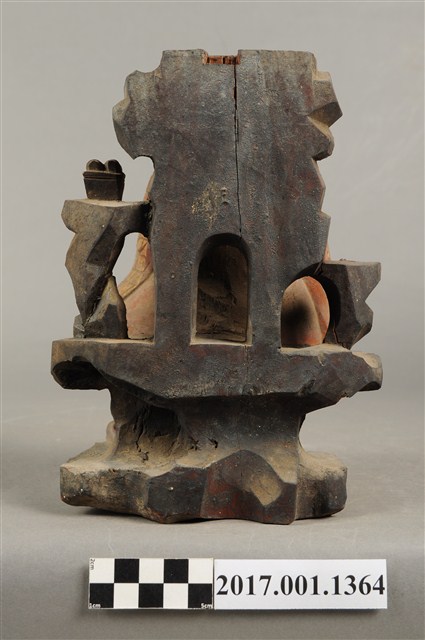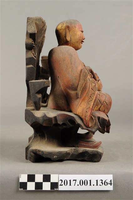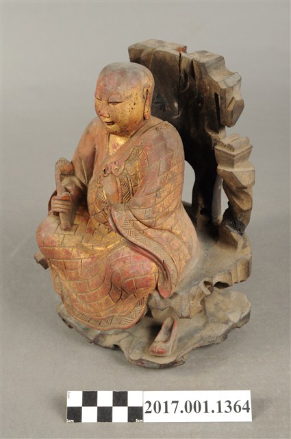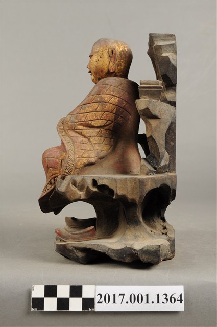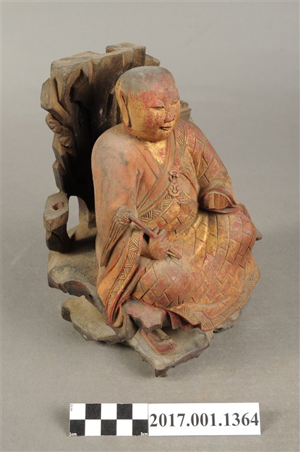 1.本件木雕普庵祖師像,作結跏趺坐姿態,作在岩座上,身後有延伸至頭頂之岩石寶蓋,表面施作塗裝、安金不見紅粧佛技法,粧佛局部剝落。顏面表現青年比丘相貌,額頭有白毫,雙眼垂視,山根塌、鼻樑短,身著右衽寬袖僧袍,胸前有袈裟環釦,袈裟以錦雕表現衣緣紋飾、袍面表現方格福田衣紋。跣足,雙足盤腿,左手掌損毀、右手握著拂塵。岩座下方放置雙履,祖師身後左右立石如柱,左側柱頂放置方函卷軸。