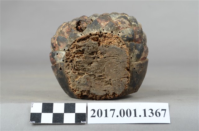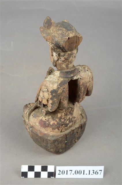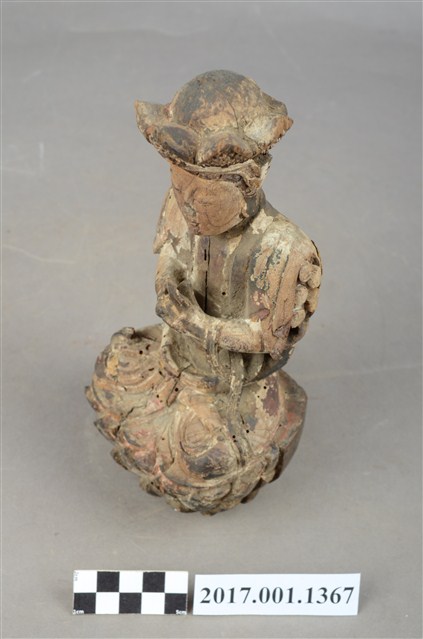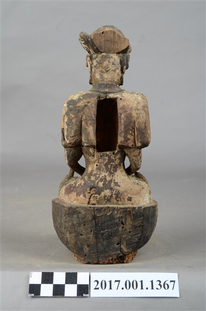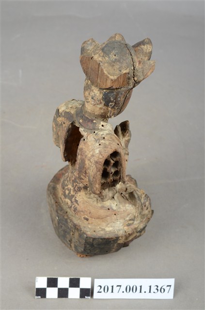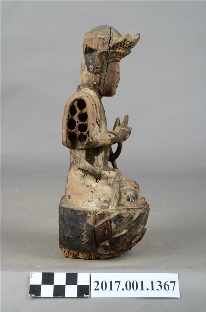 1.本件木雕準提觀世音菩薩像,坐結跏趺坐姿態,坐於仰蓮式蓮座上,表面施作塗裝粧佛技法,漆面嚴重剝落,背面開有長方形入神洞,封榫佚失,內容物件已取出。頭戴冠,雙眼垂視,鼻子的鼻眉肌與皺眉肌相連,山根塌、鼻樑短,身著襦,肩披雲肩,上手臂披著飄帶纏環垂至雙腳,右飄帶缺失。雙足盤腿,本件原有十八手臂,上二手結準提印置於胸臆前、下二手相疊成禪定印,左右上手臂各有七個洞可插入手臂,然而手臂缺失。