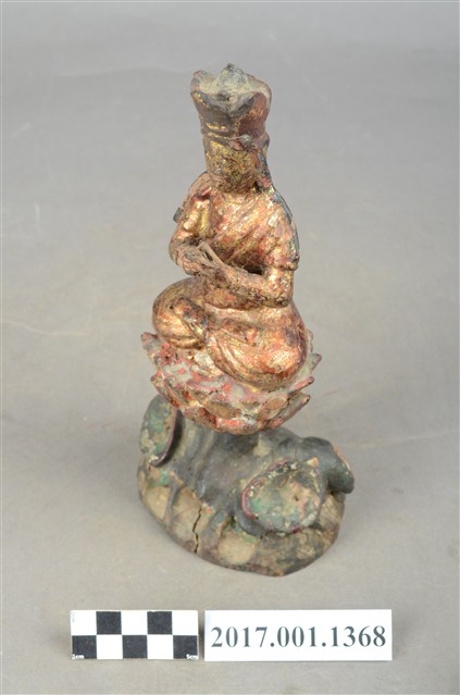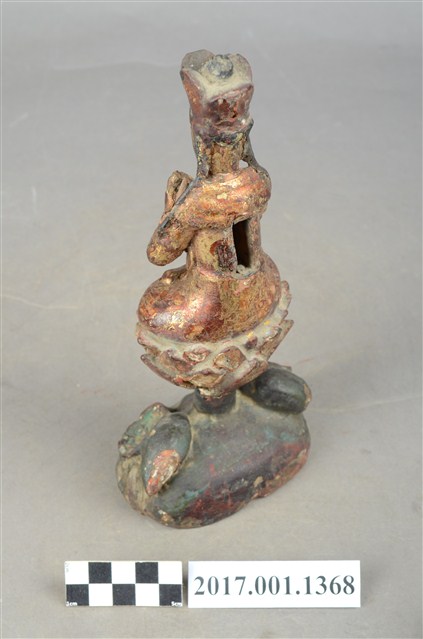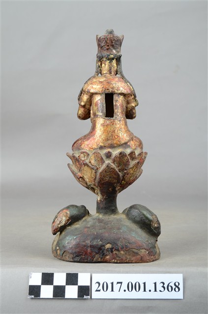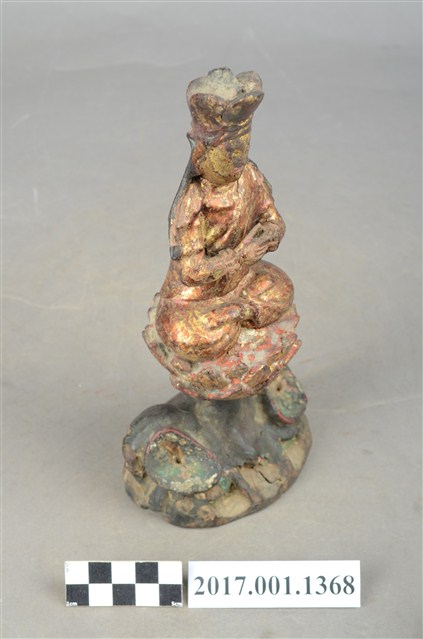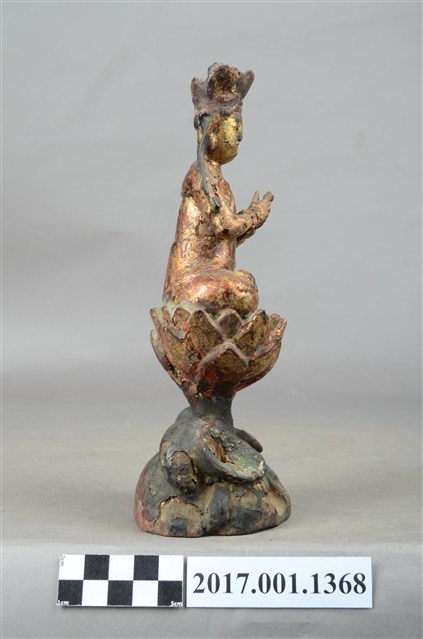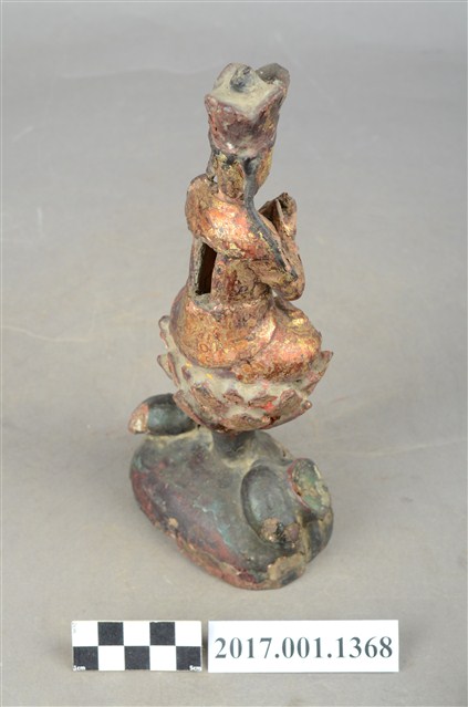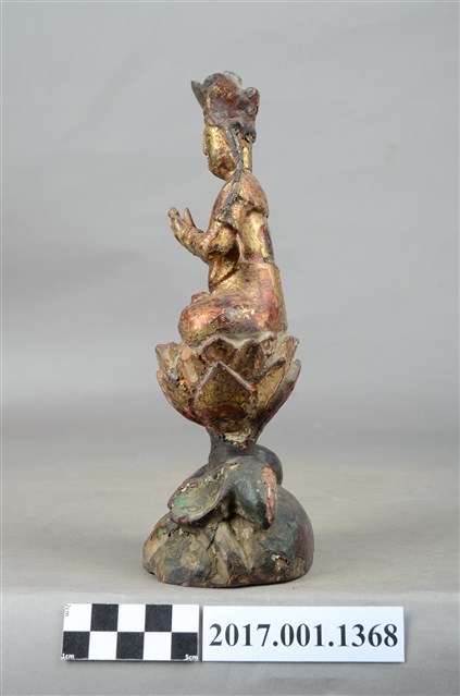 1.本件木雕準提觀世音菩薩像,作結跏趺坐姿態,坐於仰蓮式蓮座上,表面施作塗裝、安金不見紅粧佛技法,粧佛局部剝落,背面開有長方形入神洞,封榫佚失,內容物件已取出。造像頭戴冠,山根塌、鼻樑短,身著襦,肩披雲肩。雙足盤腿,本件僅有兩手臂,左右手結準提印置於胸臆前。蓮座下有蓮莖、臺座,表現類似《佛說七俱胝佛母準提大明陀羅尼經》對於準提佛母蓮座的描述。
