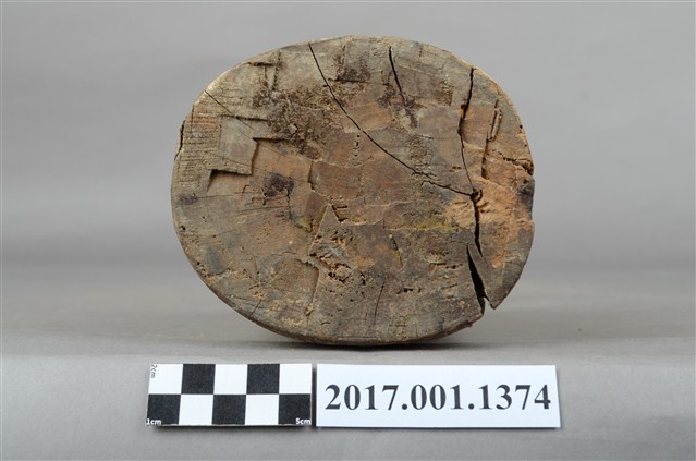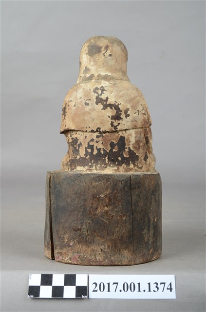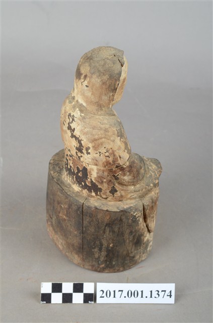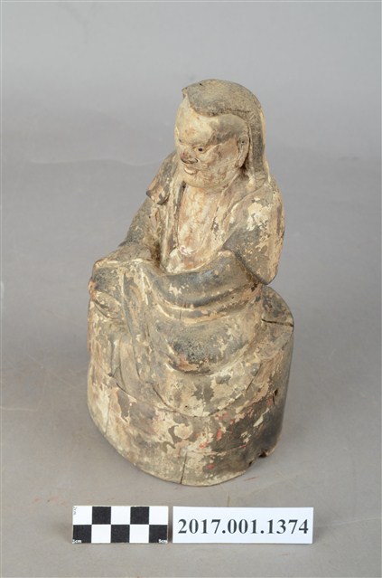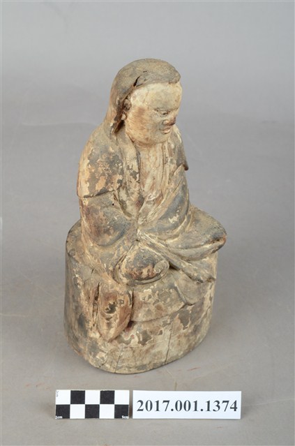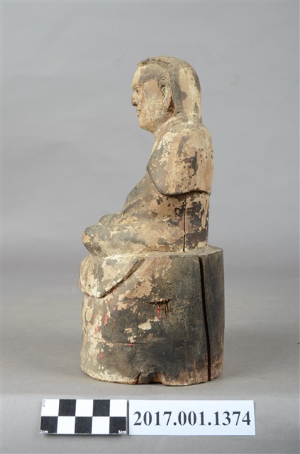1.本件木雕達摩祖師像,作結跏趺坐姿態,表面施作塗裝粧佛技法,漆面嚴重剝落。頭戴布帽,雙眼瞠目,肩披衣巾,身著寬袖僧袍,展露出胸膛。雙足盤腿,手臂受袍服所覆蓋,雙手相交置於右膝上。