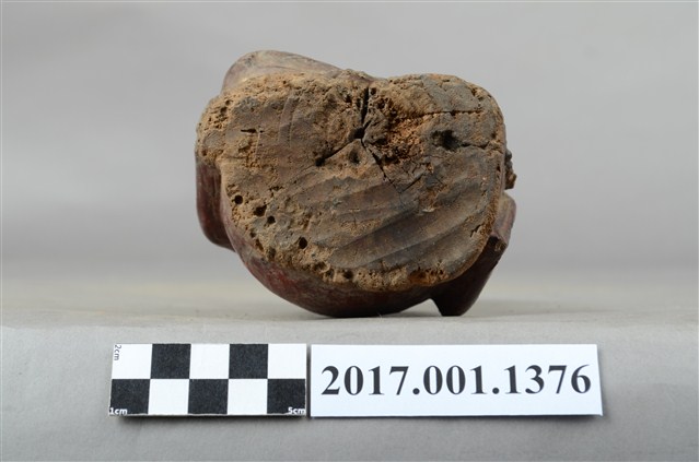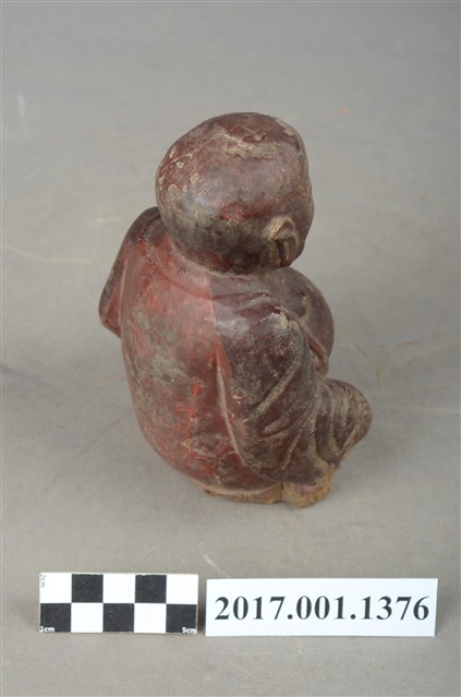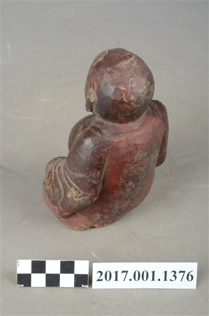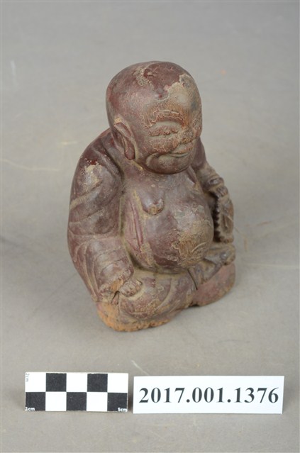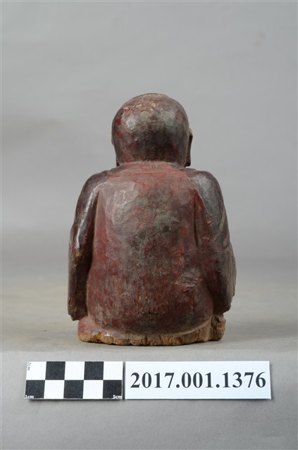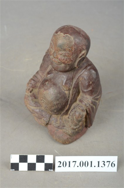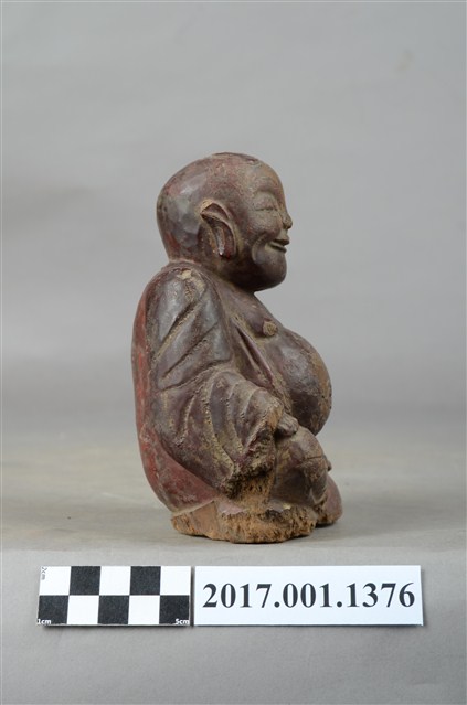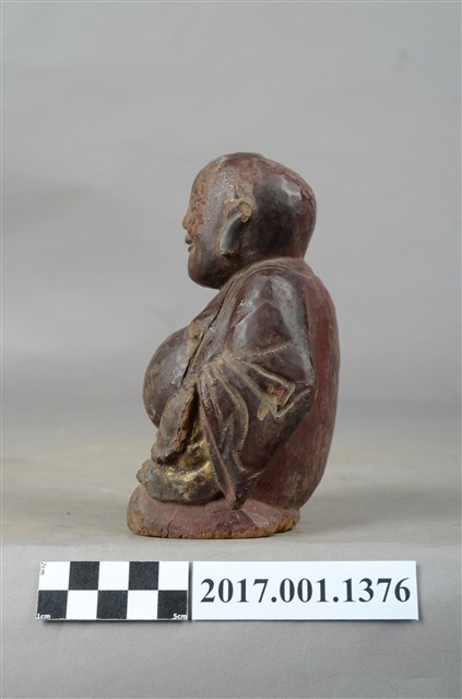 1.本件木雕彌勒佛像,作自在坐姿態,表面施作塗裝粧佛技法,局部漆面剝落。顏面表現壯年比丘相貌,臉型輪廓圓潤,雙目半睜,山根塌、鼻樑短,上半身露出胸膛,體態豐腴,肚凸腹大。跣足,左足屈膝、右腿屈膝內伸,右手置於右膝,左手握念珠置於左膝。