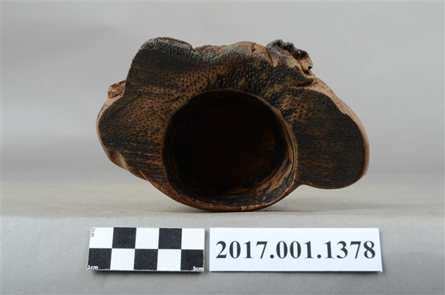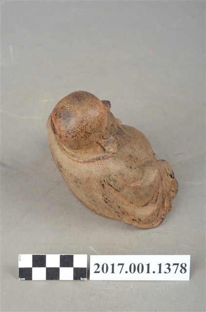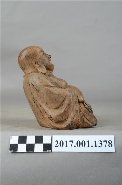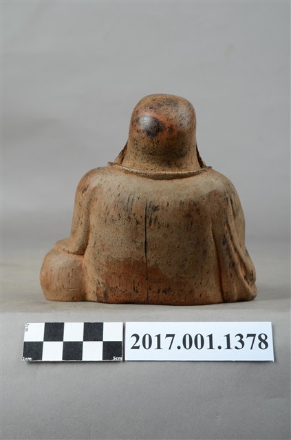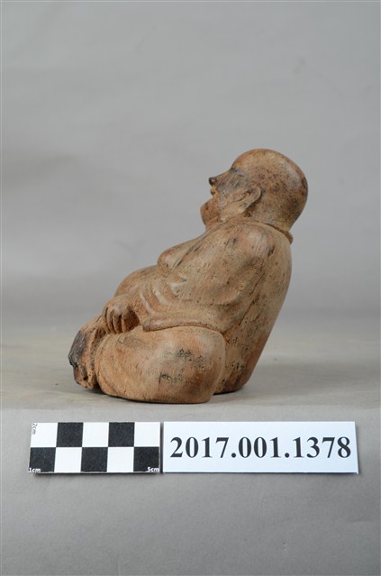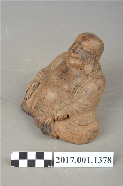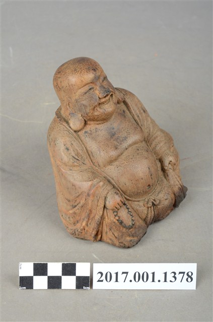1.本件木雕彌勒佛像,作自在坐姿態。顏面表現壯年比丘相貌,臉型輪廓圓潤,雙目半睜,山根塌、鼻樑短,雙脣微開,耳垂及肩,上半身露出胸膛,體態豐腴,肚凸腹大。體態往後仰,跣足,坐姿為左足屈膝、右腿屈膝內伸,左手握布袋置於左膝,右手握念珠置於右膝。