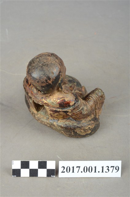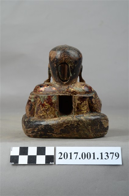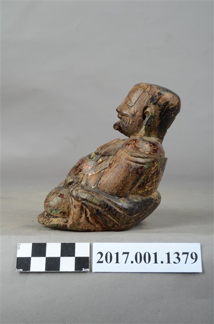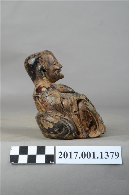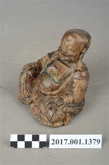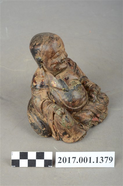 1.本件木雕彌勒佛像,作自在坐姿態,表面施作塗裝、安金不見紅粧佛技法,粧佛局部剝落,頭部、背部開有方形入神洞,內容物件已取出。顏面表現老年比丘相貌,臉型輪廓圓潤,額頭抬頭紋深邃,雙目半睜,山根塌、鼻樑短,嘴開,耳垂及肩,上半身露出胸膛,體態豐腴,肚凸腹大。體態往後仰,坐姿為左足屈膝、右腿屈膝內伸,左手握布袋置於左膝,右手握拳置於右膝。