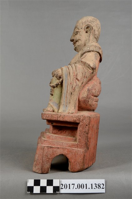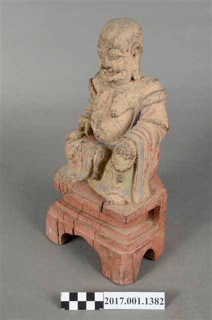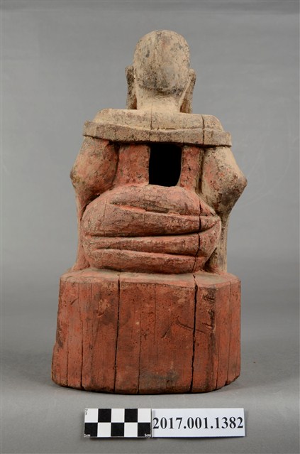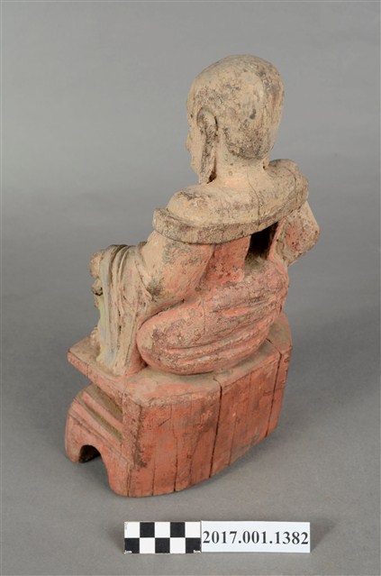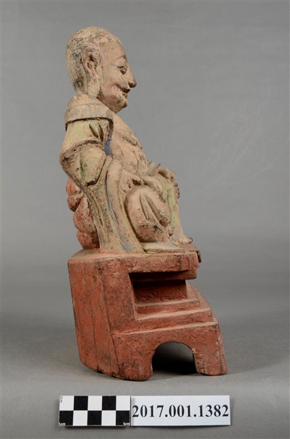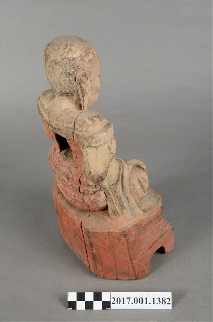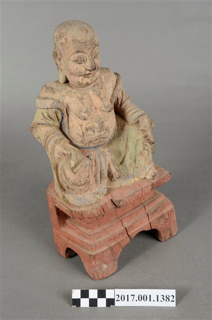 1.本件木雕彌勒佛像,作自在坐姿態,表面施作塗裝粧佛技法,漆面剝落嚴重,背面開有方形入神洞,內容物件已取出。顏面表現壯年比丘相貌,臉型輪廓圓潤,額頭抬頭紋深邃,雙眼垂視,山根塌、鼻樑短,上半身露出胸膛,體態豐腴,肚凸腹大,坐在金剛座上。跣足,左足屈膝、右腿屈膝內伸,左手握念珠置於左膝,右手握袋置於右膝。金剛座下有臺座。