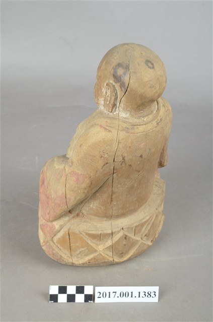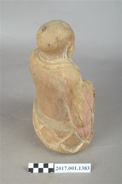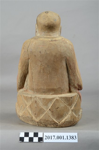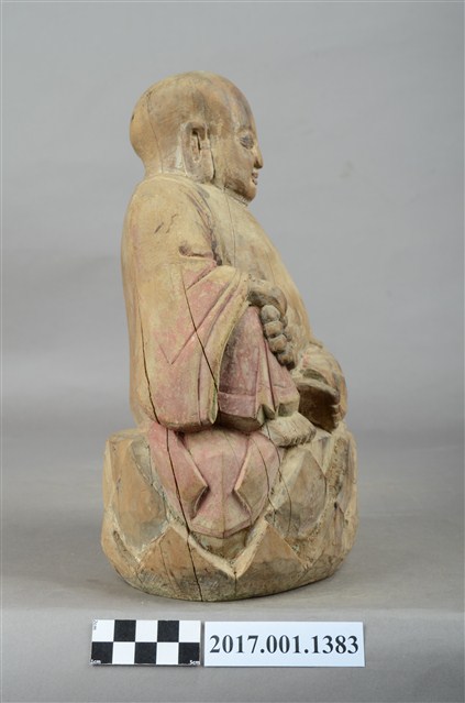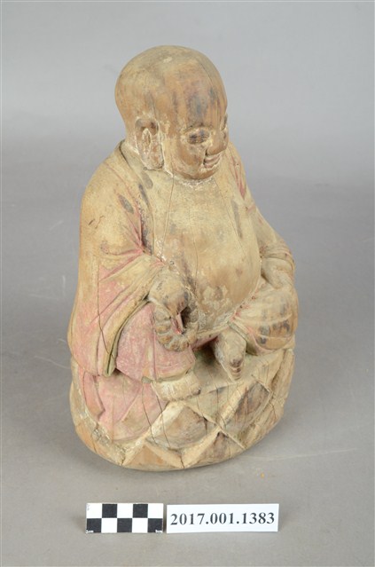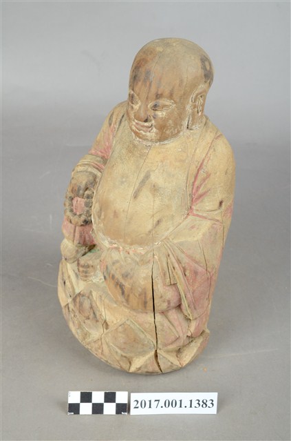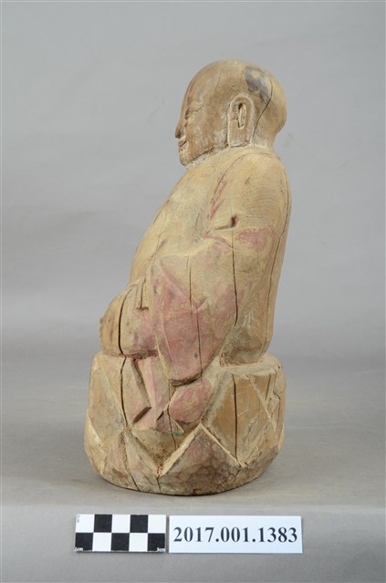 1.本件木雕彌勒佛像,作自在坐姿態,坐在仰蓮式蓮座上,粧佛已褪去。顏面表現壯年比丘相貌,臉型輪廓圓潤,雙目半睜,雙脣微開,上半身露出胸膛,體態豐腴,肚凸腹大。跣足,右足屈膝、左腿屈膝內伸,左手置於左膝,右手握念珠置於右膝。