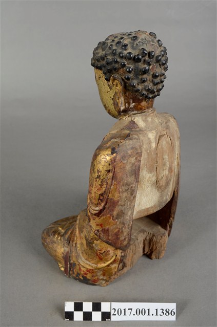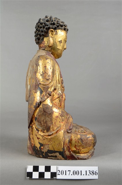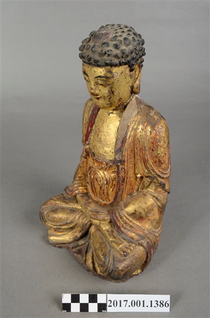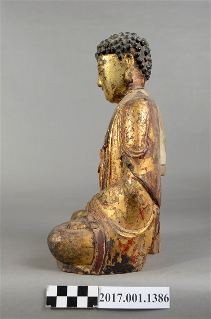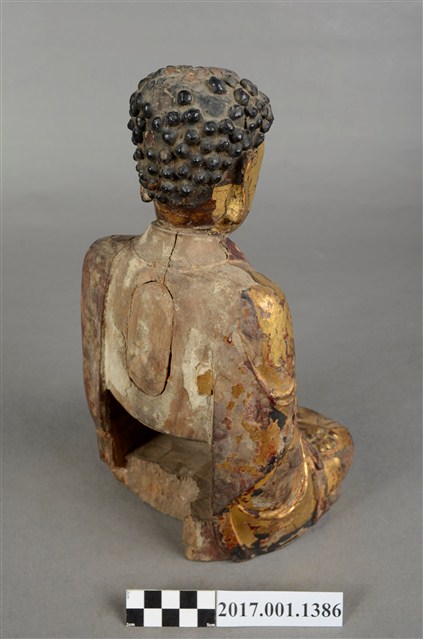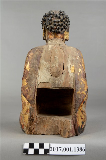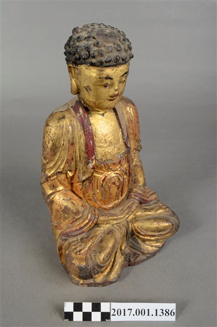 1.本件木雕釋迦牟尼佛像,作結跏趺坐姿態,頭部平塗黑漆,表面採安金不見紅粧佛技法表現,僧袍衣領則平塗紅漆,背面下半部向內挖鑿,背面上半部開有橢圓形入神洞,封榫尚存。身披雙領垂肩式的僧袍,雙手手臂受出水式衣紋覆蓋。雙足盤腿,而右腳在上又稱為「吉祥坐」,雙掌相疊成禪定印置於腹前。