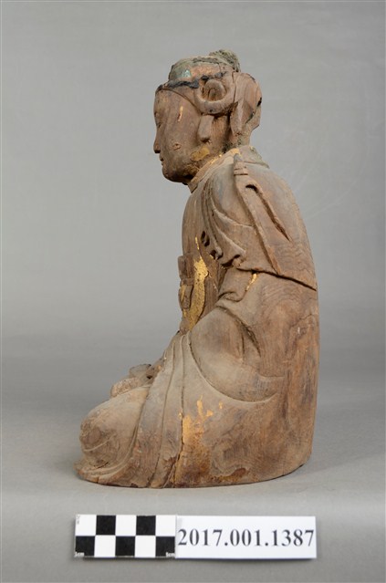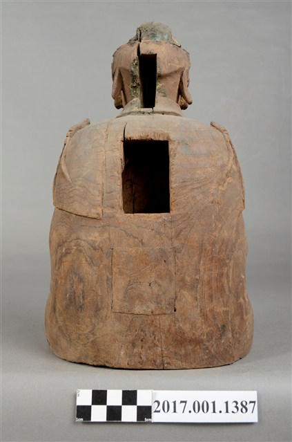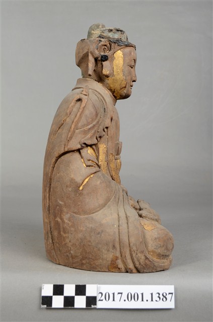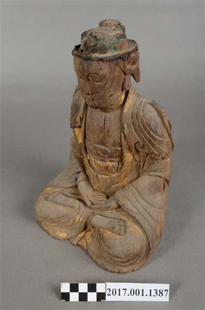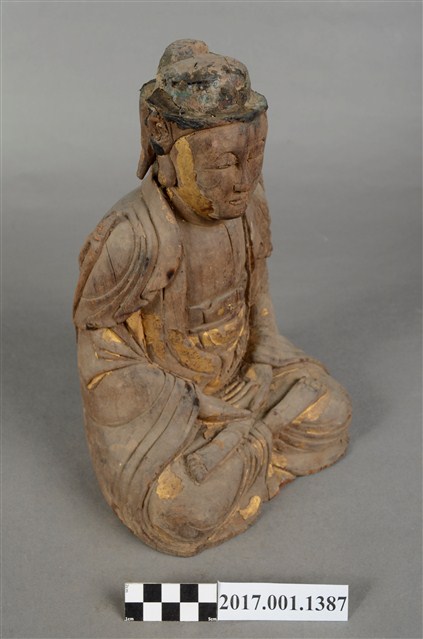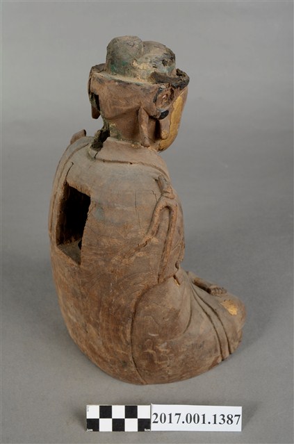 1.本件木雕釋迦牟尼佛像,作結跏趺坐姿態,表面施作安金不見紅粧佛技法表現,頭部平塗黑漆,粧佛剝落嚴重,僅造像胸前、雙足、臉頰尚保有部分安金,背面於頭部、背部開有長方形入神洞,封榫佚失,內容物件已取出。身著雙領垂肩式的僧袍,雙手手臂受出水式衣紋覆蓋。雙足盤腿,而右腳在上又稱為「吉祥坐」,雙掌相疊成禪定印置於腹前。
