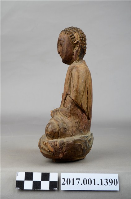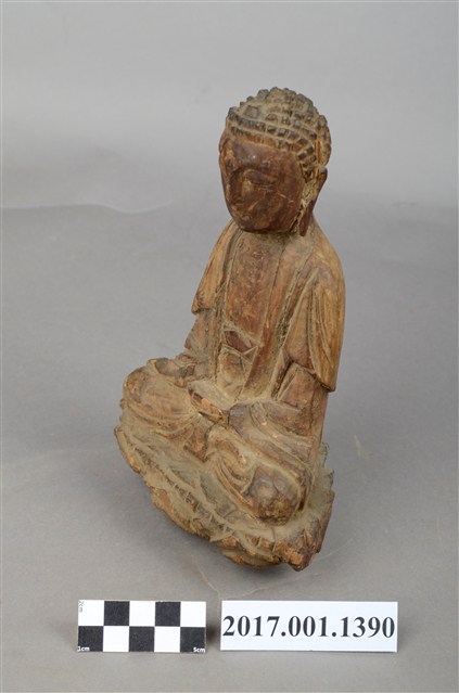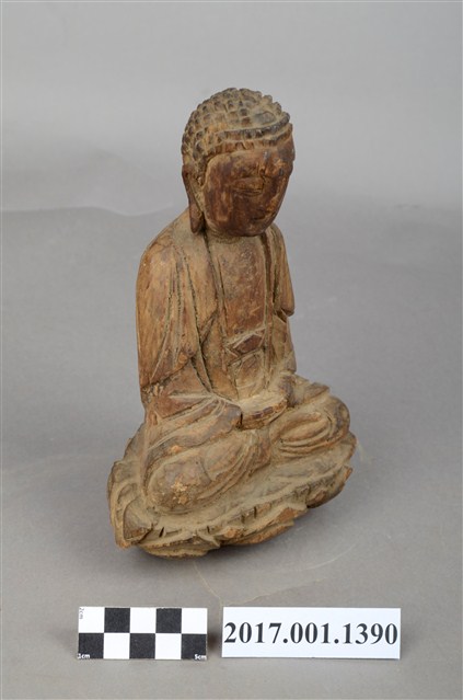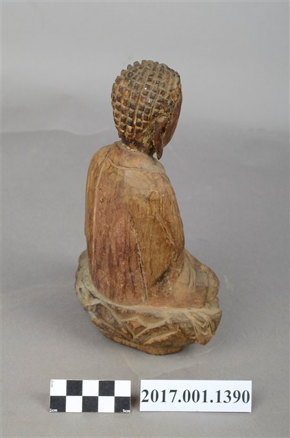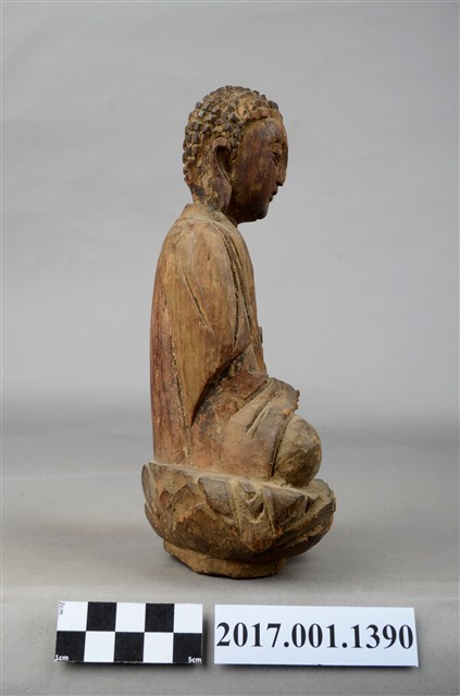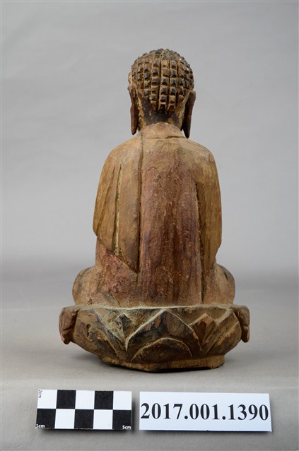 1.本件木雕釋迦牟尼佛像,作結跏趺坐姿態。身披雙領垂肩式的僧袍,雙手手臂受出水式衣紋覆蓋,坐於蓮座上。雙足盤腿,而右腳在上又稱為「吉祥坐」,雙掌相疊成禪定印置於腹前。蓮座為仰蓮式。