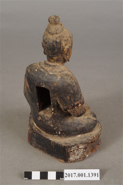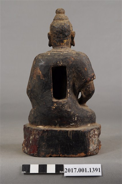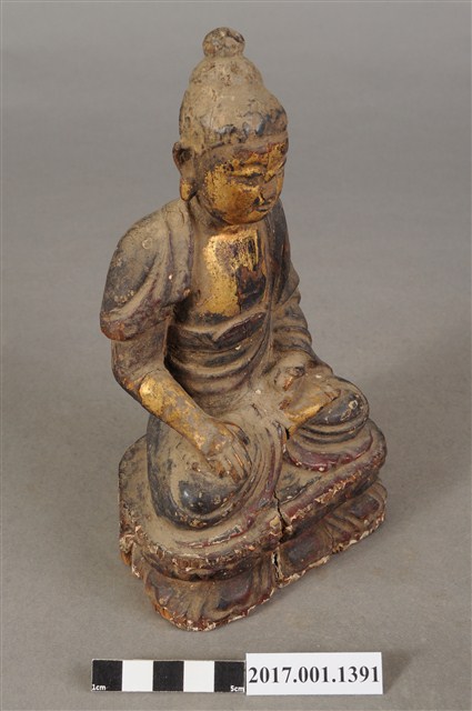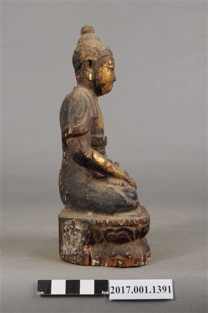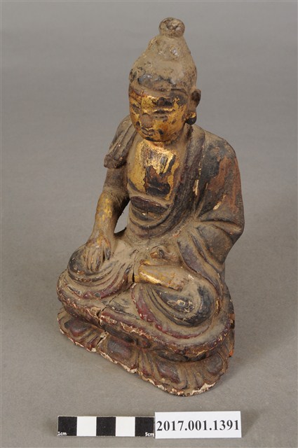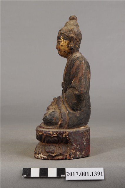1.本件木雕釋迦牟尼佛像,作結跏趺坐姿態,表面在髮髻、袍服、蓮座施作平塗上彩,肌膚以安金不見紅的粧佛技法表現,粧佛已嚴重脫落,背面開有長方形入神洞,內容物件已取出。頭部分為髮髻、肉髻、寶髻三層,而非常見表現成髮髻、肉髻,身披雙覆肩式僧袍,手臂受出水式衣紋覆蓋,坐於蓮座之上。雙足盤腿,而右腳在上又稱為「吉祥坐」,左手掌為拇指與中指、無名指相捻的期克印,左手掌置於左膝上,右手放掌置於右膝前。蓮座為束腰仰覆蓮式。