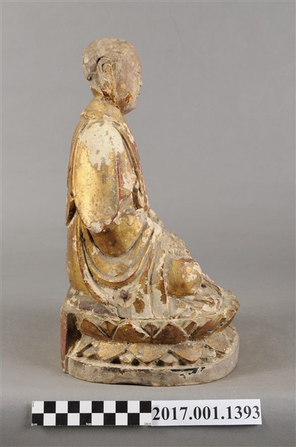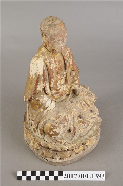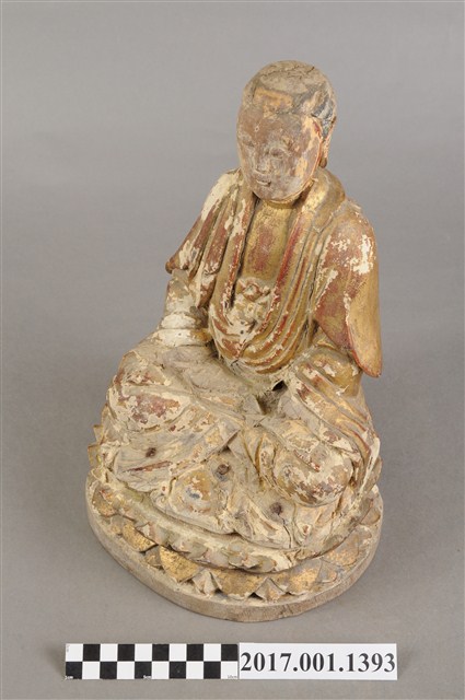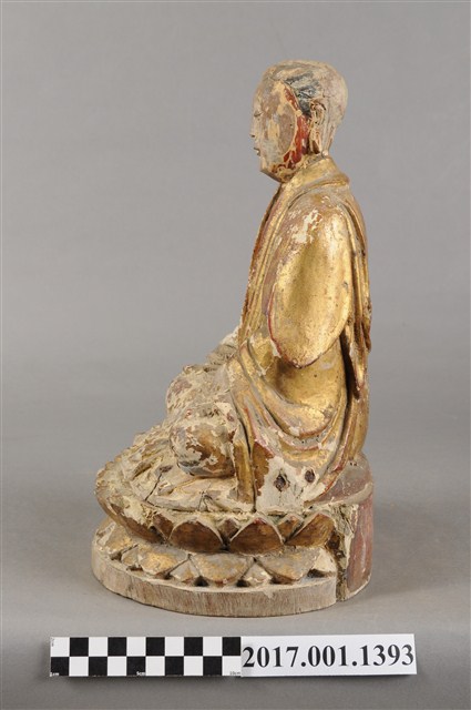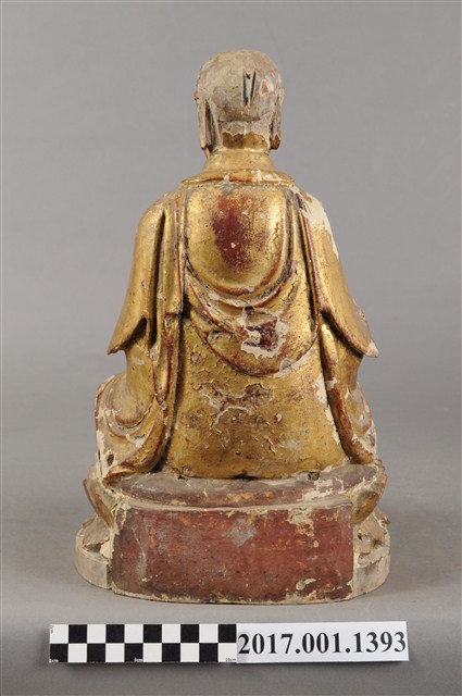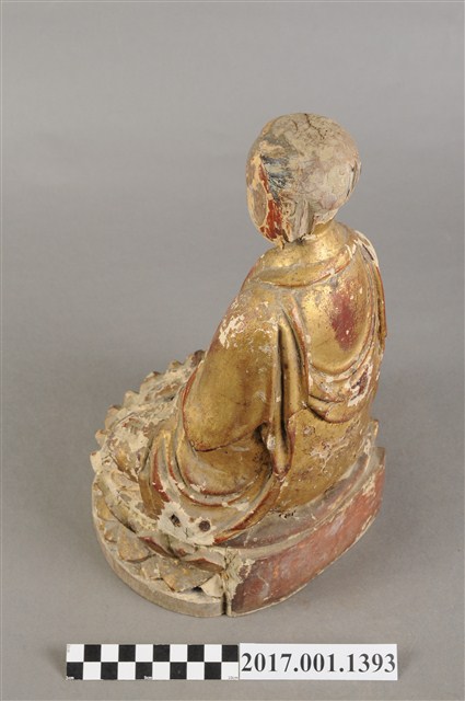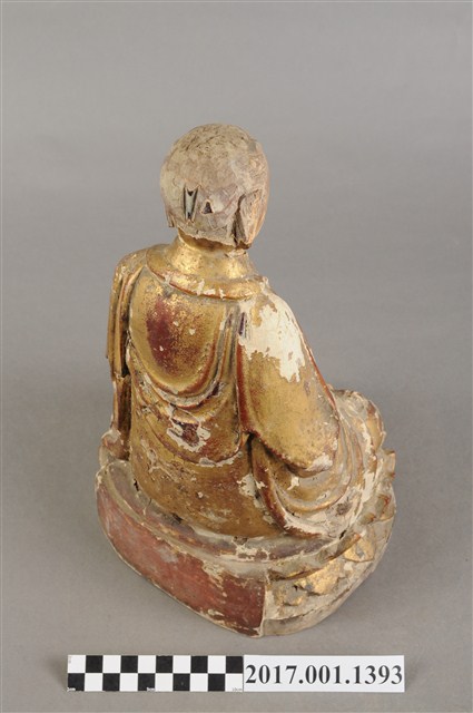 1.本件木雕釋迦牟尼佛像,作結跏趺坐姿態,作於蓮座之上,表面施作安金不見紅粧佛技法,粧佛已嚴重脫落。頭部並無肉髻、鏍髮,身披雙覆肩式僧袍,手臂受出水式衣紋覆蓋。雙足盤腿,而右腳在上又稱為「吉祥坐」,雙掌相疊成禪定印置於腹前。蓮座為束腰仰覆蓮式。