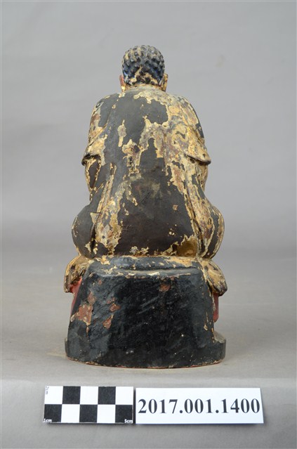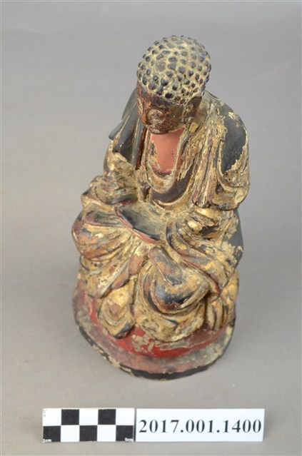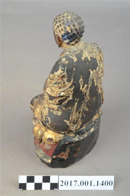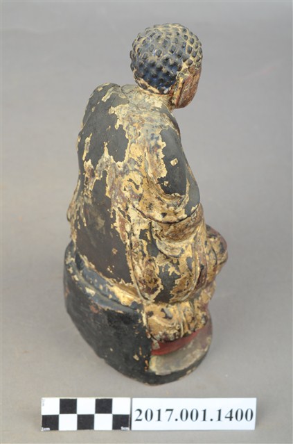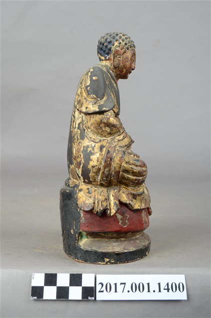 1.本件木雕釋迦牟尼佛像,作結跏趺坐姿態,表面施作安金不見紅粧佛技法,頭部、臺座可見局部平塗黑漆,胸膛、手掌、臺座可見褐色漆。頭部表現鏍髮、肉髻珠,頭無肉髻,扮相身披雙覆肩式的僧袍,雙足盤腿,而右腳在上又稱為「吉祥坐」,雙手相疊成禪定印置於腹前。臺座為雙層圓臺。