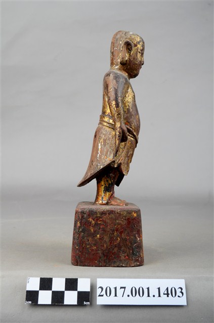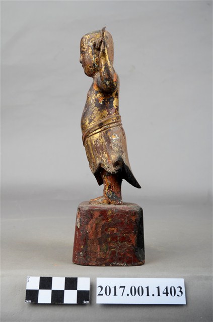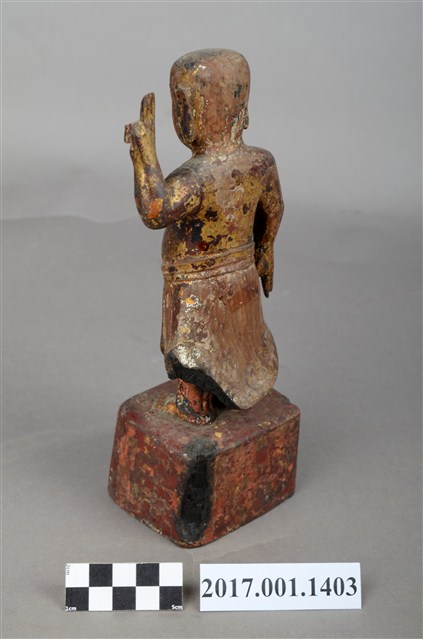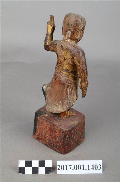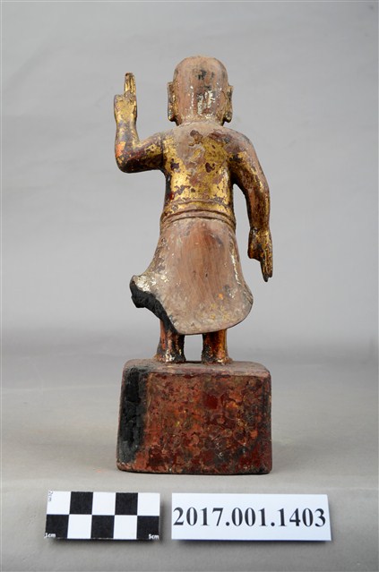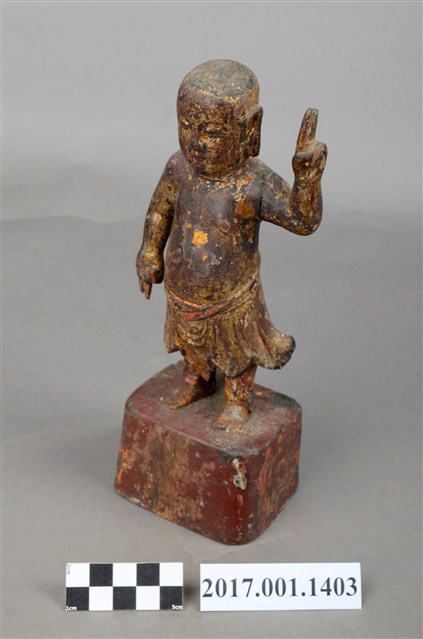 1.本件木雕釋迦牟尼佛誕生像,作站姿姿態,表面採安金不見紅粧佛技法,粧佛剝落嚴重。造像為表現釋迦牟尼佛誕生時的樣貌,因而呈現無髮的孩童形象,雙手手指豎食指與中指收三指,左手向上、右手朝下,上半身赤裸、下半身圍著布,立像挺身跣足站於臺座之上,臺座呈方形。