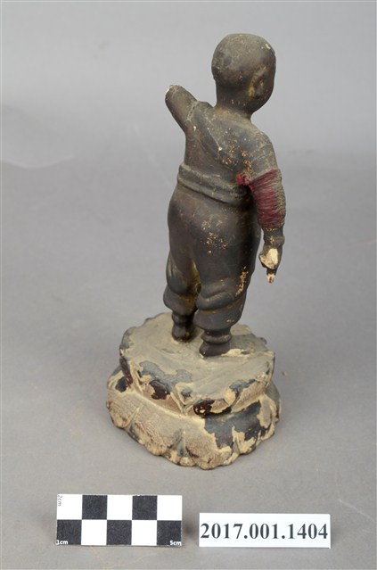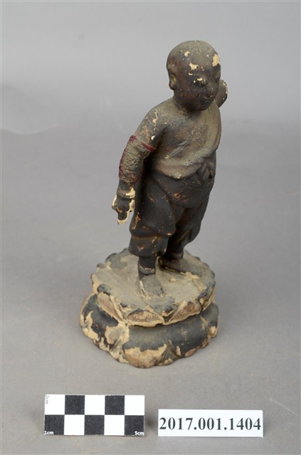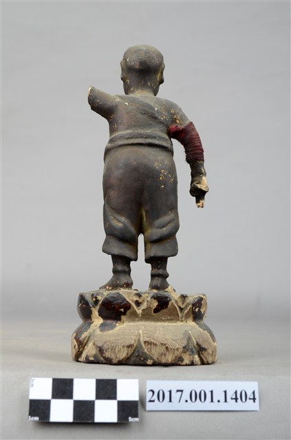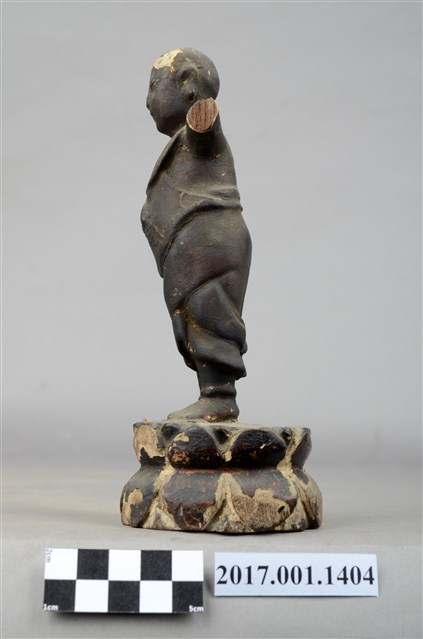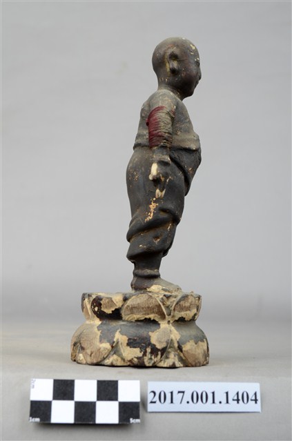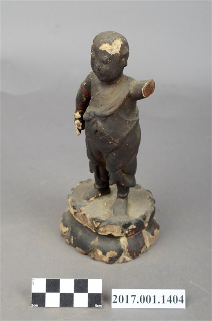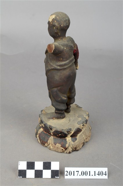 1.本件木雕釋迦牟尼佛誕生像,作站姿姿態,表面施作塗裝粧佛技法,局部漆面剝落。造像為表現釋迦牟尼佛誕生時的樣貌,因而呈現無髮的孩童形象,左手往上指、右手朝下,身著肚兜並腰繫布帶、穿褲,跣足站於蓮座之上,左手已斷裂缺失、右手腕纏繞棉線。
