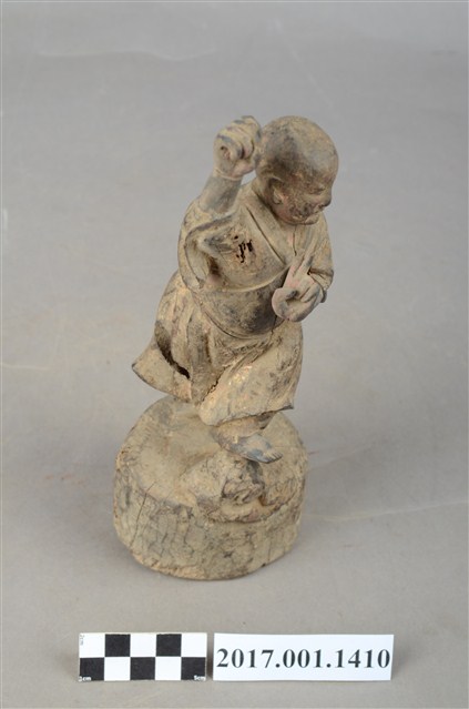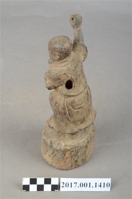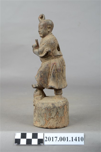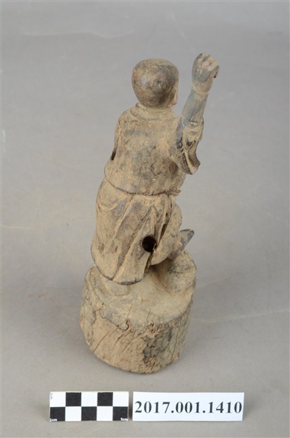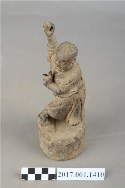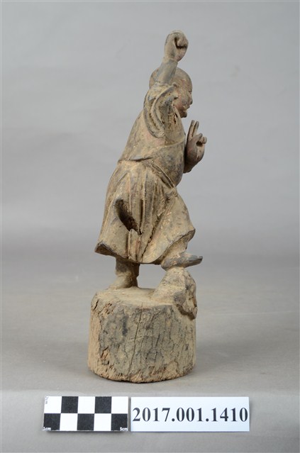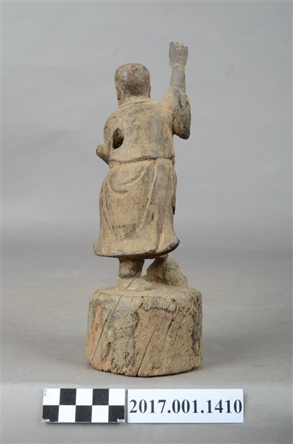 1.本件木雕伏虎羅漢像,作站姿姿態,表面已無法了解粧佛作法,背部開有圓形入神洞,內容物件已取出。顏面表現緊抿著嘴唇,身著右衽寬袖僧袍,腰繫布帶,於腰際綁成結,手腳綁帶。立像挺身以雙足丁字步的姿態站於臺座上,左手伸食指與中指收三指橫置於胸前、右手握拳高舉。本件判斷為伏虎羅漢,在於右手握拳應是手握金剛圈。