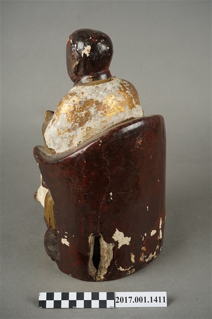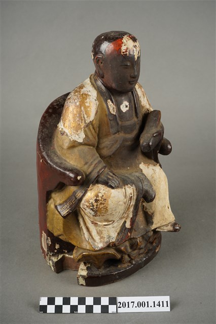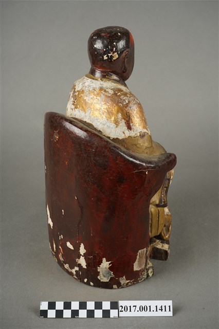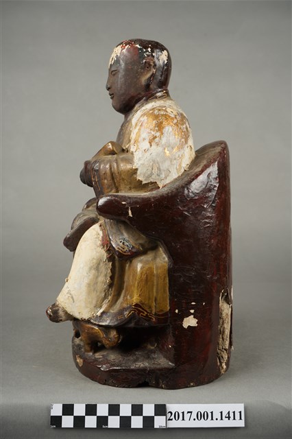 1.本件木雕進經羅漢像,作坐姿姿態,表面施作塗裝、安金不見紅粉線盤飾粧佛技法,粧佛局部剝落。顏面表現青年比丘相貌,雙眼垂視,山根塌、鼻樑短,身著寬袖僧袍,左手捧書卷橫置於胸前、右手放掌置於右膝,坐於圈背椅上。右腿盤起、左腳踏於蓮花上。椅前雕塑蓮花。