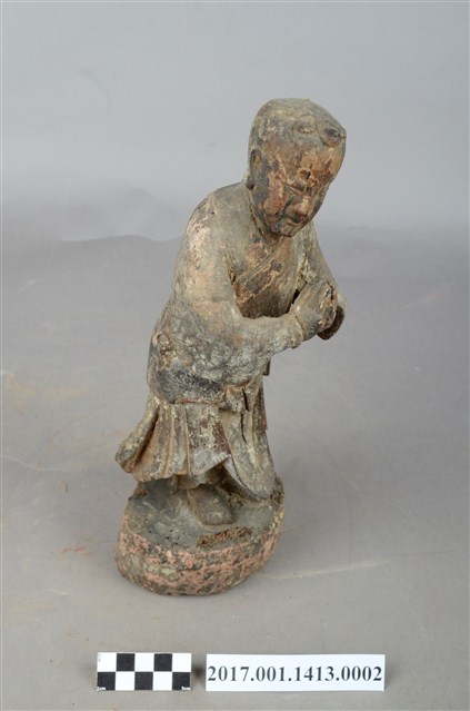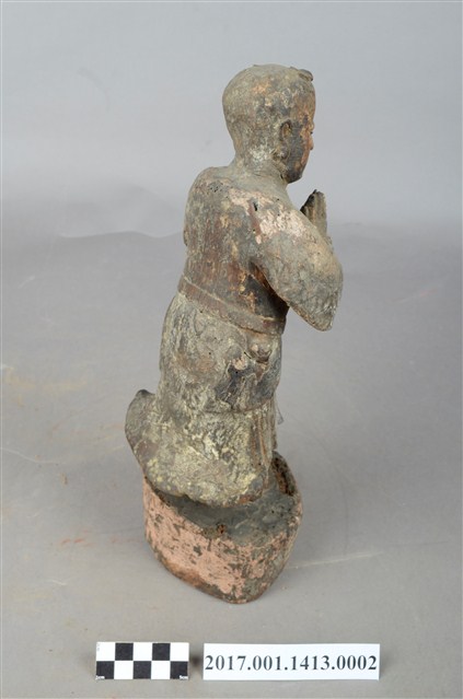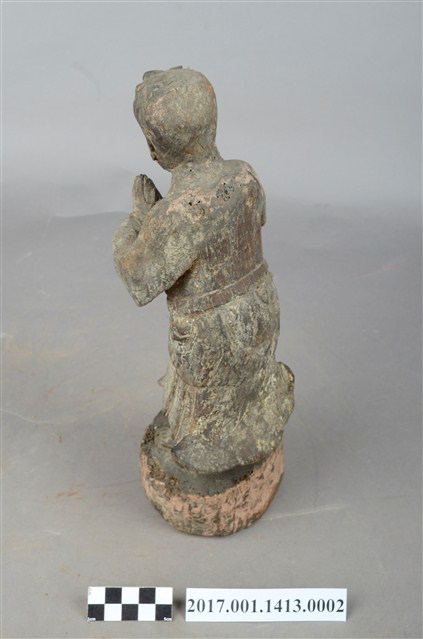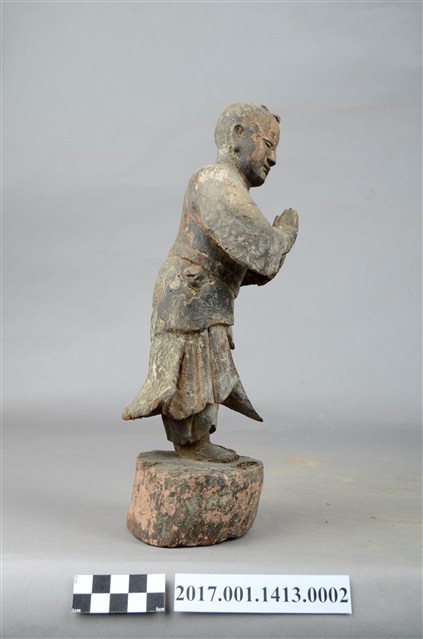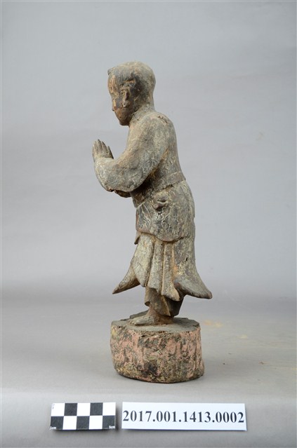 1.本件木雕善財童子像作立姿,表面粧佛已褪色並佈滿污漬,袍服下襬中央一道縱裂紋。善財童子作孩童臉,頭部微側向右方,作仰視貌,頭頂梳單片垂髫,身軀略向前躬,著圓領窄袖過膝袍服,雙手合十於胸前,腰間繫有腰帶。雙足並立,跣足,站立於矮圓臺,臺面上端有蛀蝕細孔。