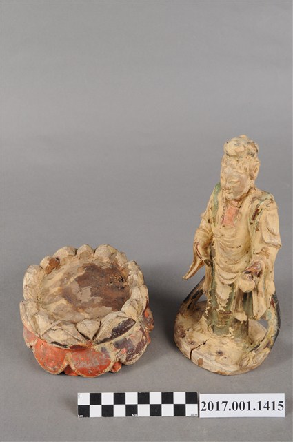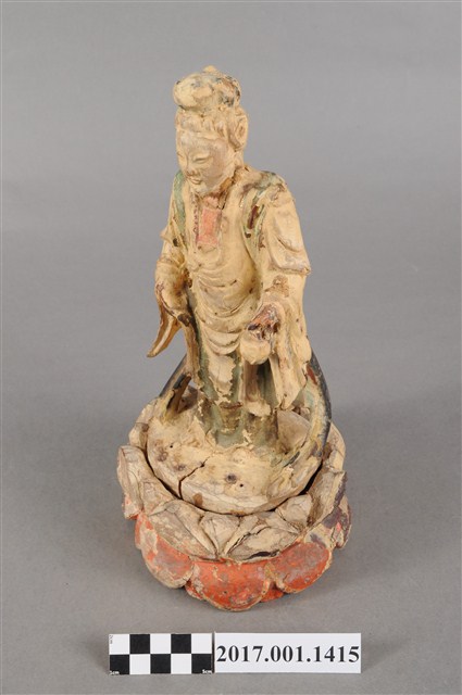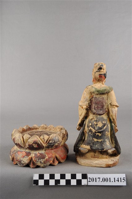 1.本組木雕觀世音菩薩像,作立姿,左手提一小籃,為魚籃觀世音菩薩造形,粧佛嚴重脫落,僅下頷、胸前、頭部後方殘留朱紅色,衣袍殘留青色。菩薩臉部作橢圓形,雙眼平視,頭梳高髻,身著寬袖袍服,袒胸。右手小臂前伸,手掌下垂,左手小臂前伸,手掌朝上,提一只小籃,雙腳站立於臺座上,裙襬兩側有飄帶下垂至臺座,觀世音菩薩像可放於蓮座上,蓮座施朱漆。