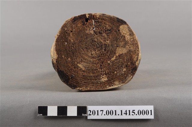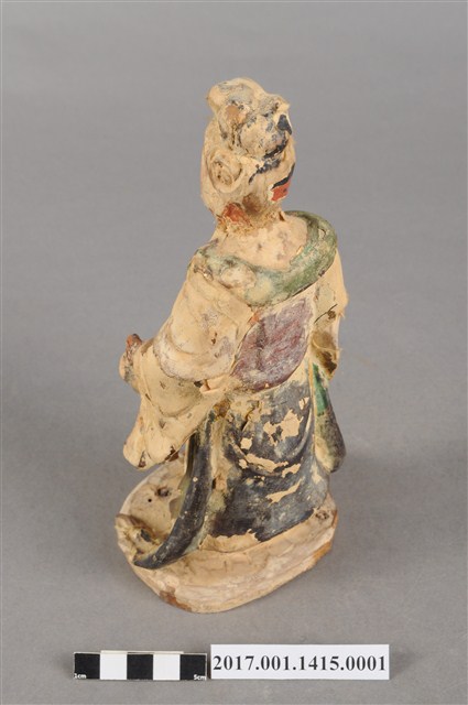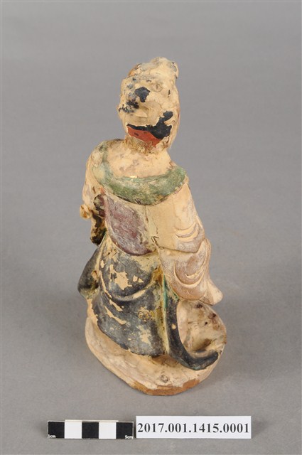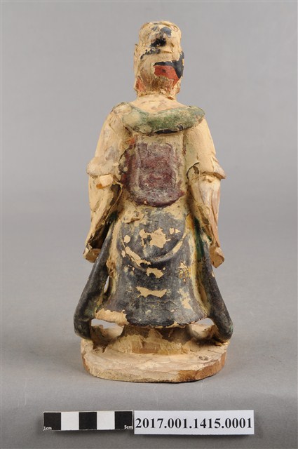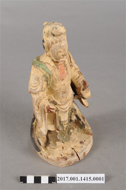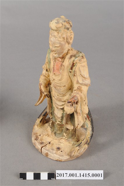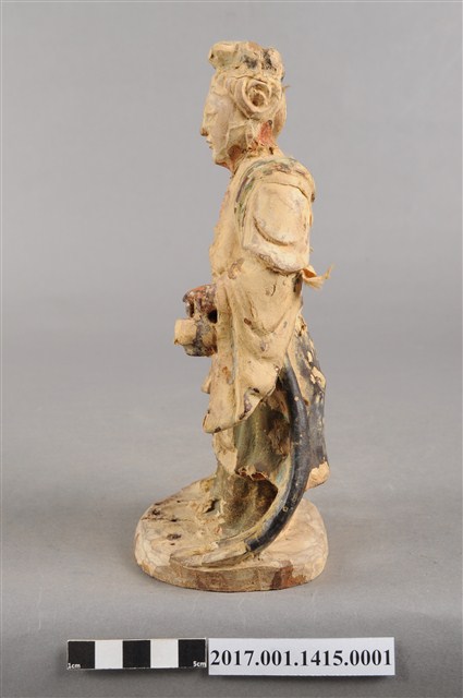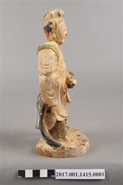 1.本件木雕觀世音菩薩像,作立姿,左手提一小籃,為魚籃觀世音菩薩造形,表面粧佛嚴重脫落,僅下頷、胸前、頭部後方殘留朱紅色,衣袍殘留青色。菩薩臉部作橢圓形,雙眼平視,頭梳高髻,身著寬袖袍服,袒胸。右手小臂前伸,手掌下垂,左手小臂前伸,手掌朝上,提一只小籃,雙腳平行站立於臺座上,裙襬兩側有飄帶下垂連至臺座。