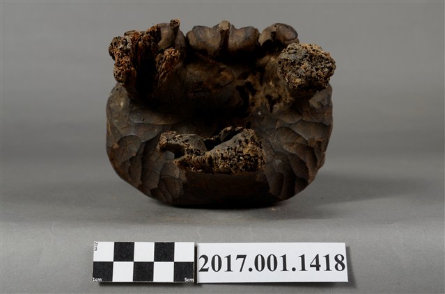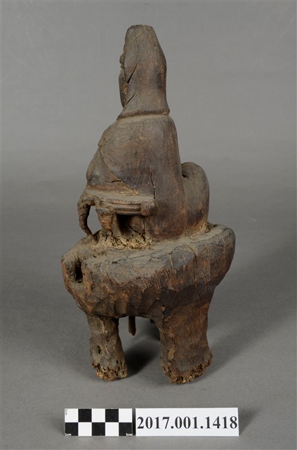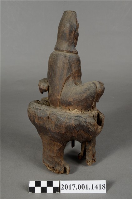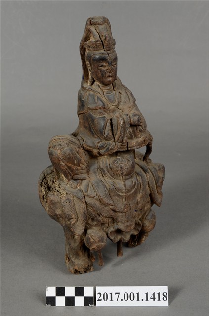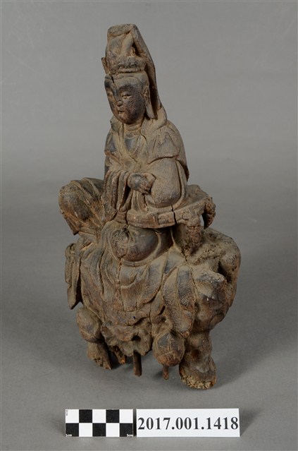 1.本件觀世音菩薩像採坐姿造形,以木雕方式製作,粧佛已脫落。菩薩坐於三足岩座上,岩座下方中間有一株蓮葉,左右兩旁各一株含苞蓮花,象徵菩薩清淨無染如蓮。岩座中間懸空,岩座的石柱有破損蛀蝕情形。觀世音菩薩臉孔娟秀,鼻部磨損,頭披風帽並戴五佛冠,冠上有五方佛小像,冠下有風帽,底緣垂在兩肩之前,身穿長袍,裝束樸素。腰部繫著一個寶相花狀的腰佩,腰佩下方連一帶有葫蘆狀的長穗子。菩薩作遊戲坐姿態,左腿向內彎,平擱於椅面,右腿屈膝小腿斜立於前。左右兩手彎曲交抱於胸前,右手在前,左手在後,雙手手肘靠在身前一張半弧形憑几上,憑几連到左後腰部,左側几腿作獅腳造形,足部微彎上翹,呈上寬下窄之狀。