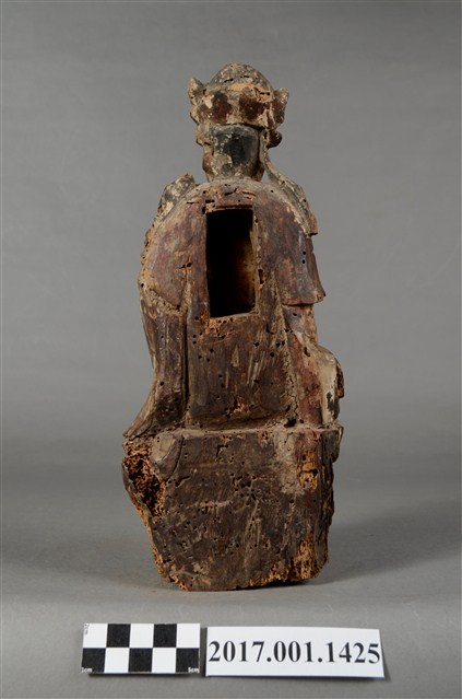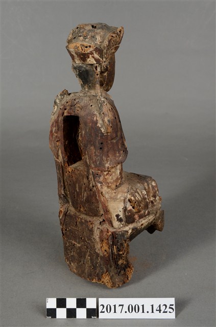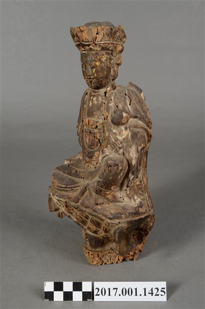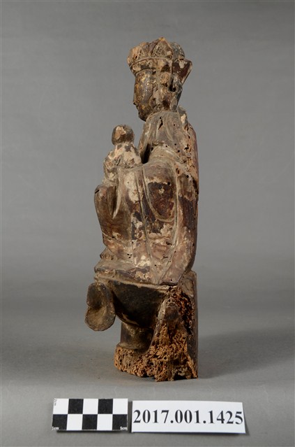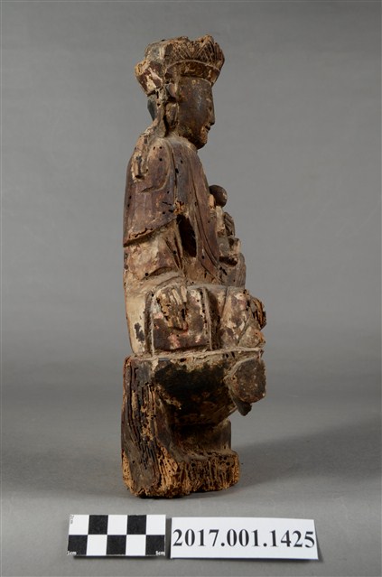1.本件觀世音菩薩像採坐姿,作送子觀世音菩薩造形,以木雕方式製作,表面粧佛已脫落。背部挖有一長方形入神洞,內部物件已取出,封榫佚失。菩薩坐於一方蓮座上,蓮座下方前半部挑空,只有後半部連結臺座,本件蛀蝕嚴重。觀世音菩薩頭戴五佛冠,耳後本垂兩條長冠帶,右側後方的冠帶缺損,僅餘左方的冠帶,身穿長袍披肩。菩薩作遊戲坐姿態,右腿向內彎,平擱於蓮座上,左腿屈膝小腿斜立置於右腳前,右膝部分受損。左手抱一小兒,安放於屈膝且小腿斜立的左大腿上,右手下臂缺損。