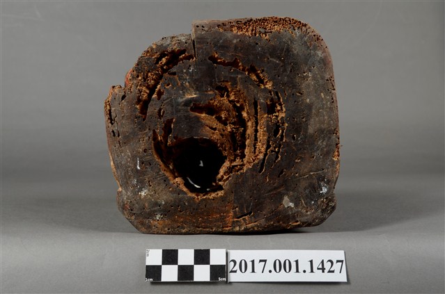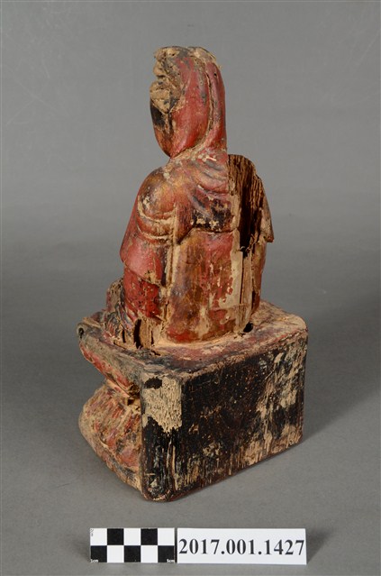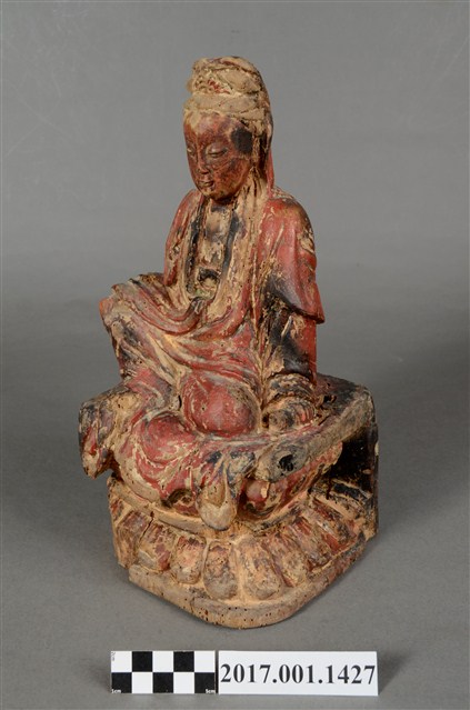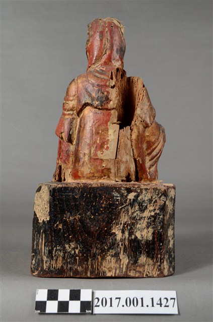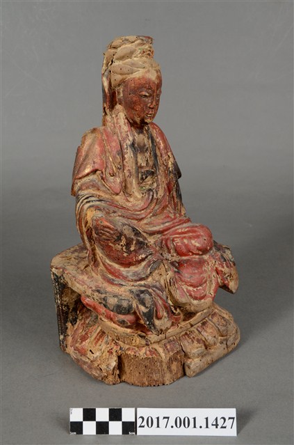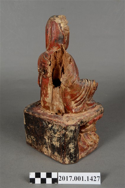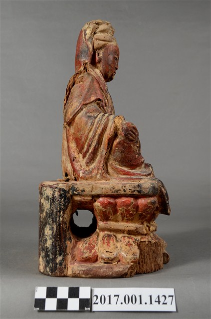 1.本件觀世音菩薩像採坐姿造形,以木雕方式製作,表面的漆面脫落,露出底層紅色漆面。背後腰部挖有一長方形入神洞,封榫仍在。菩薩坐於臺座上,臺座前面雕刻一朵上下相反對襯舒展的蓮花座,中間呈束腰狀,象徵菩薩清淨無染如蓮,臺座後面為方臺,方臺與蓮花間鏤空,破損嚴重露一大洞。觀世音菩薩臉孔清秀,頭披風帽,身穿長袍,裝束樸素,右後肩及腰部缺損嚴重,破一大洞。菩薩作遊戲坐姿態,跣足,左腿向內彎,平擱於座面,右腿屈膝小腿微側斜立置於左腳前,右足缺損。右手抱著右膝,左手自然垂下撐在蓮座上。