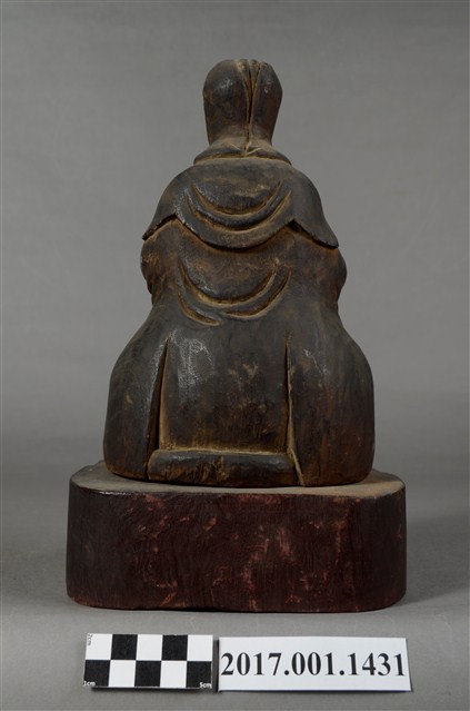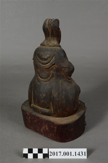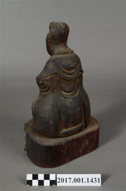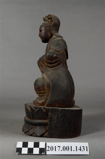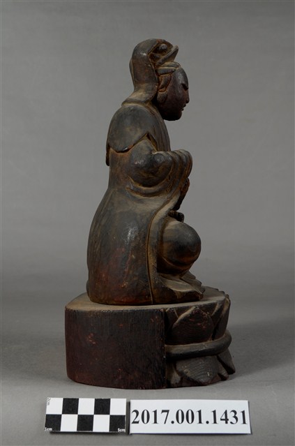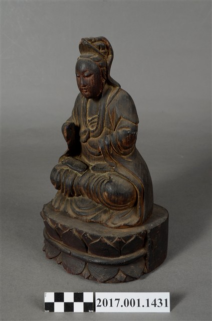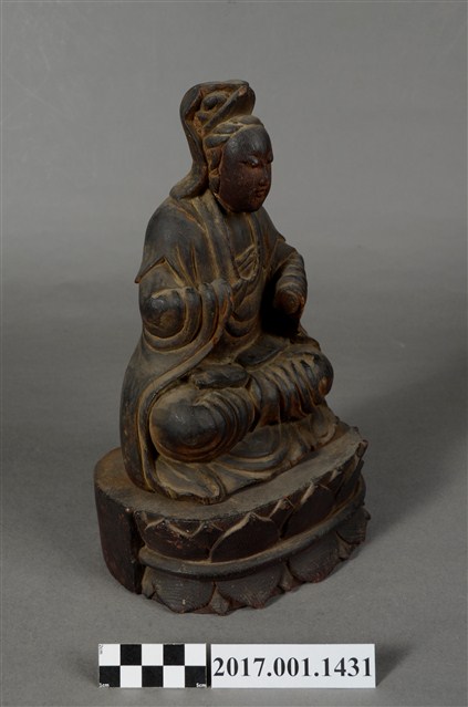 1.本件觀世音菩薩像採坐姿造形,以木雕方式製作,表面之漆面脫落。菩薩結跏趺坐於蓮座上,蓮座可分離。蓮座作一朵上下相反對襯舒展的蓮花造形,中間呈束腰狀,蓮座底部平整,象徵菩薩清淨無染如蓮。觀世音菩薩臉孔娟秀,頭披風帽,身穿長袍披肩,裝束樸素。菩薩作雙盤的結跏趺坐姿態,跣足,右腿向內彎,腳掌翻上平放於左大腿上,左腿也內彎,腳掌翻上平放於右大腿上,雙手手掌缺損。