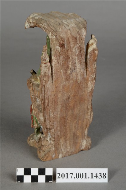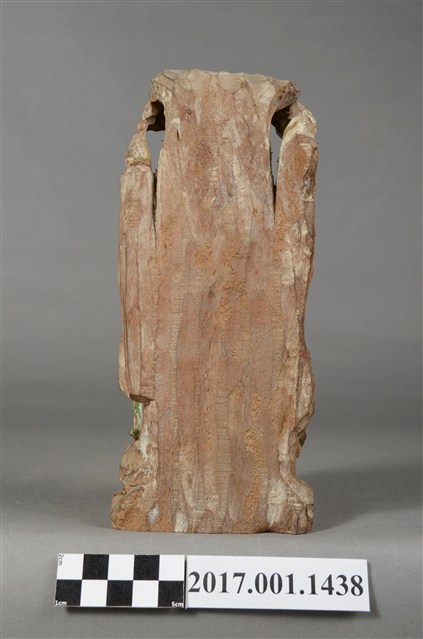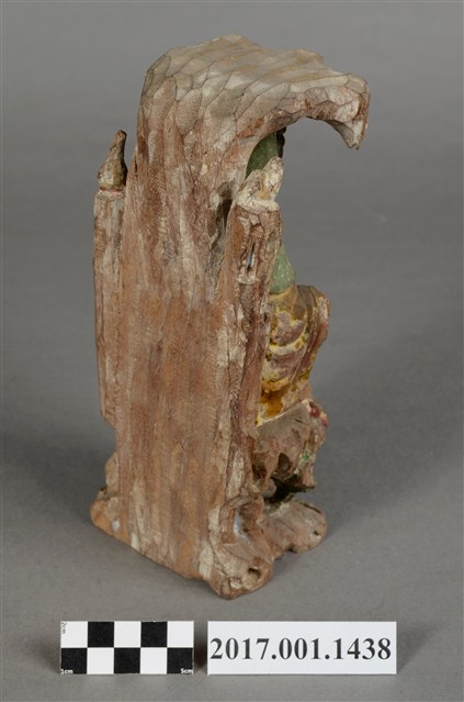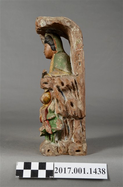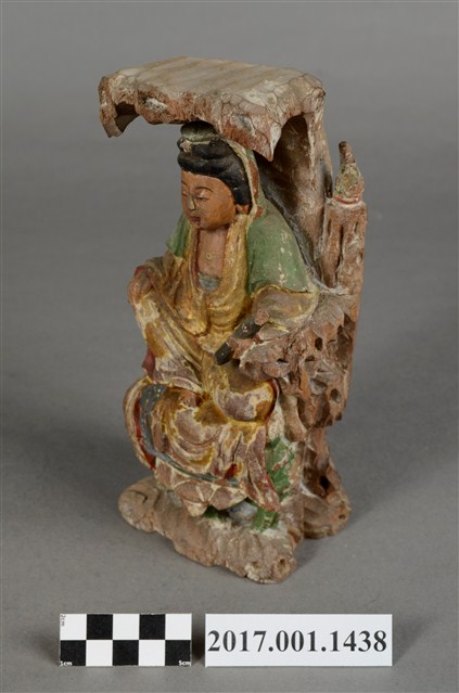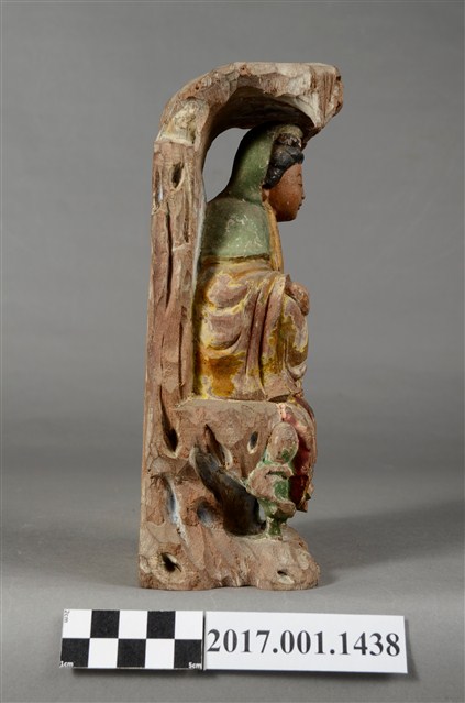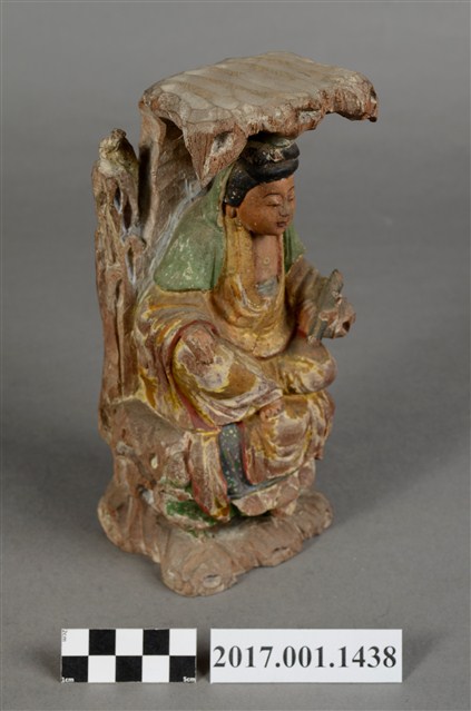 1.本件觀世音菩薩像採坐姿造形,以木雕方式製作,表面彩繪,粧佛局部已脫落。菩薩頭頂上方與背面有一連頂及座的普陀巖。菩薩岩座下方,岩座上方前面鏤空,雕刻有一蓮花,有清淨無染之意,底部平整。觀世音菩薩臉孔娟秀,頭披風帽,身穿黃色軟袍綠色披肩。菩薩作遊戲坐姿態,跣足,左腳向內彎,平貼於椅面,右腳屈膝小腿微側斜立於左腳前。右手微彎置於右腿上,手掌扶於右膝上;左手彎曲手肘輕靠於連座的岩石上,持一經卷。菩薩身左有一連接山巖的臺子,上置一只淨瓶,身右連接山巖臺上立有一隻鸚鵡。