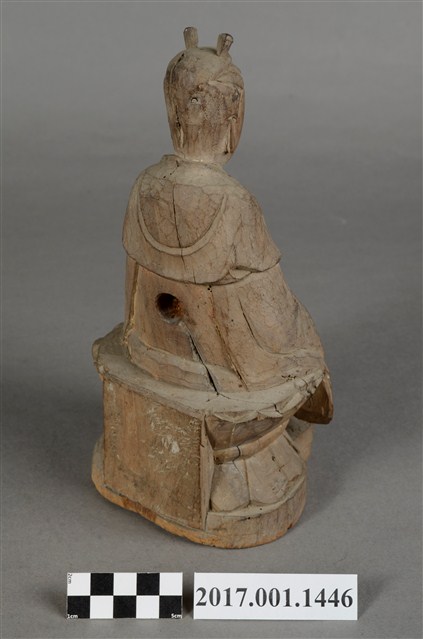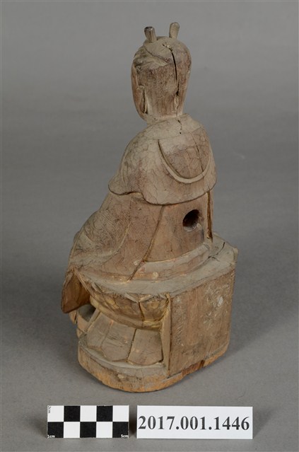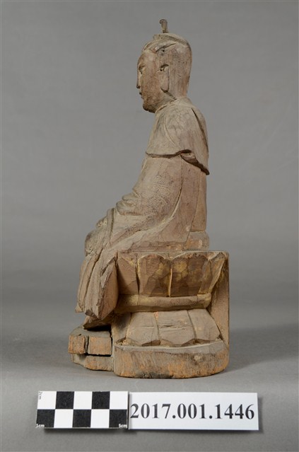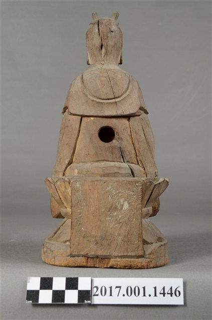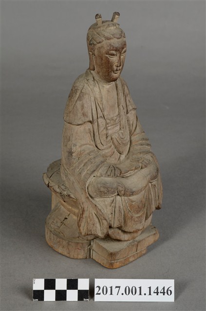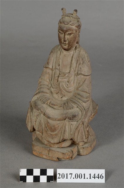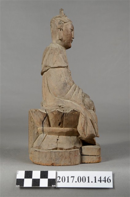 1.本件觀世音菩薩像採坐姿造形,以木雕方式製作,表面粧佛已除去。背部有一圓形入神洞,內部物件已取出。菩薩坐於蓮座上,蓮座刻有一朵上下對襯交錯舒展的大蓮花,中間有束腰,蓮座背後則連接一正四方形木塊,蓮座下有一前方後圓木臺座,有裂紋。觀世音菩薩臉孔莊嚴,頭梳雙高髻,身穿軟袍披肩。菩薩採雙盤結跏趺坐姿態,兩腿交錯,足部隱於衣袍之內。雙手手肘微彎,雙掌手心朝上交疊,右手掌在上,平放於腿上,結禪定印。