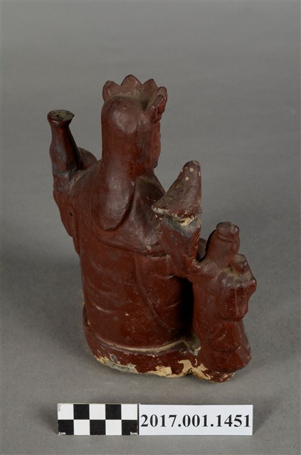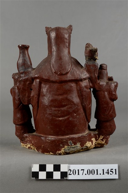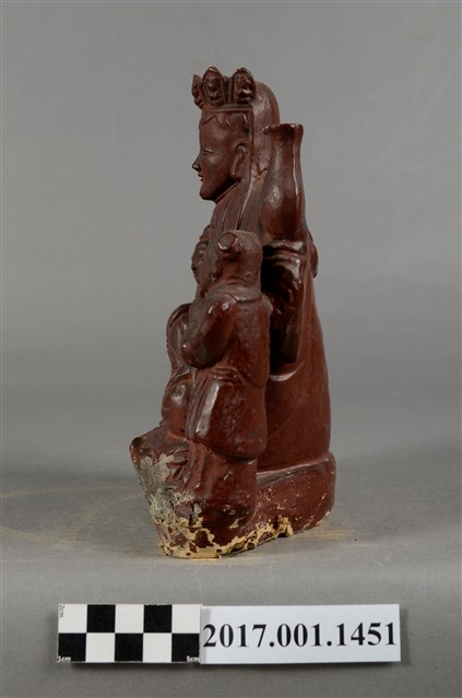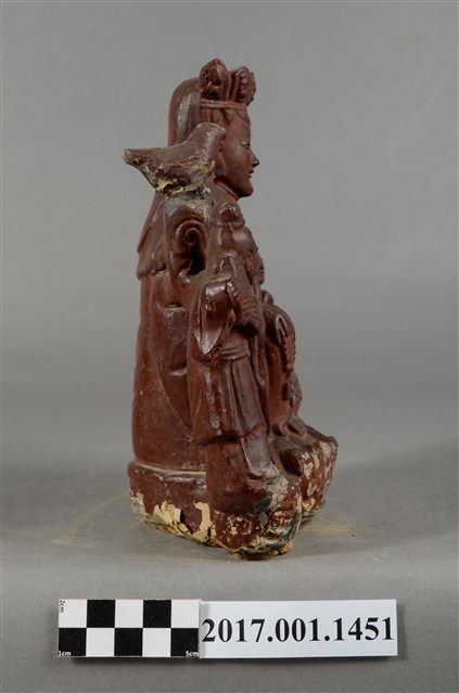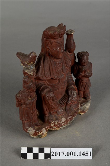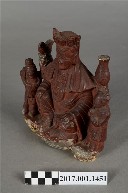 1.泥塑觀世音菩薩與善財、龍女連像作一組三像相連形式,以泥塑技法為基礎製作後,在表面裱以紗布並施暗紅色漆而成,神像臺座為施漆,露出泥胎,臺座下端之髹漆面有破損情形。三像中央作一尊觀世音菩薩之像,觀世音菩薩作遊戲坐姿態,菩薩臉孔娟秀,頭披風帽並戴五佛冠,冠上有五方佛小像,冠下有飄帶垂在兩肩之前,身穿軟袍、披肩,胸前有瓔珞裝飾。跣足,左腿平擱於蓮花座上,右腿屈膝小腿斜立,左右兩手分別扶於兩膝上,右手持一串短念珠;左手握一拂塵,垂於地上。身左臺上置一只淨瓶,身右臺上立一隻鸚鵡。觀世音菩薩左旁立善財童子,雙手合十作膜拜狀;右旁立龍女,雙手捧一只提籃。
