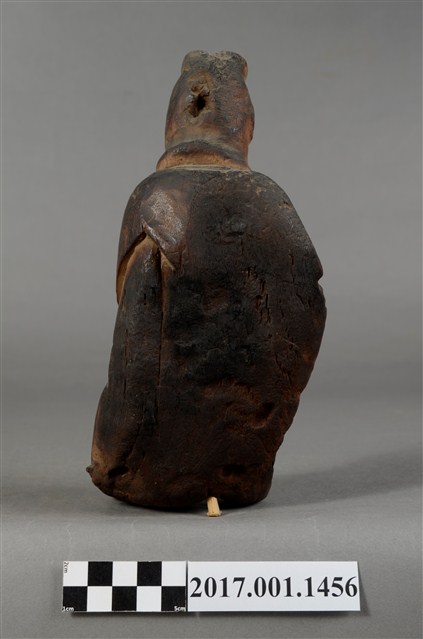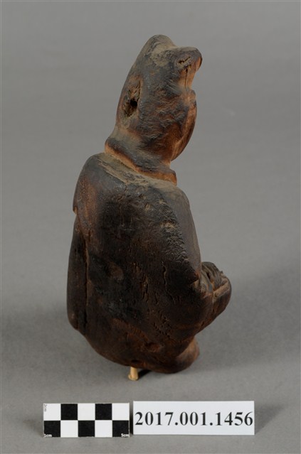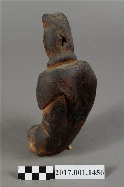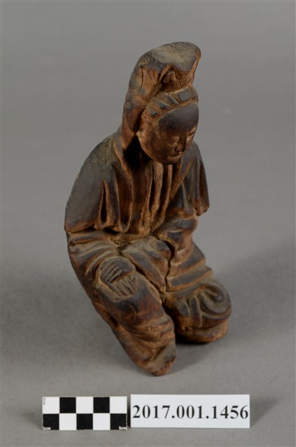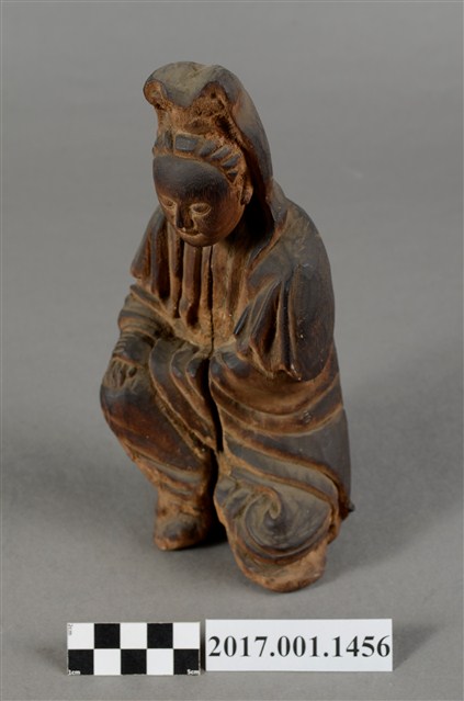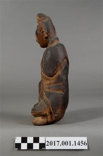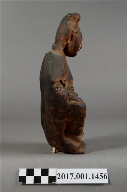 1.本件觀世音菩薩像採坐姿造形,以木雕方式製作,表面粧佛已脫落,本件菩薩自頸下有一道長裂紋。菩薩採遊戲坐姿態,神情莊嚴靜謐,頭披風帽,身穿軟袍披肩,裝束樸素。跣足,坐於地上,但臺座有點傾斜,被另加一小竹塊當支撐點。觀世音菩薩左腿內彎,平放於地上;右腿屈膝小腿微側斜立於左腳前。右手手肘彎曲傍著右腿,安放於右膝上;左手手肘彎曲,橫放於右手背上。