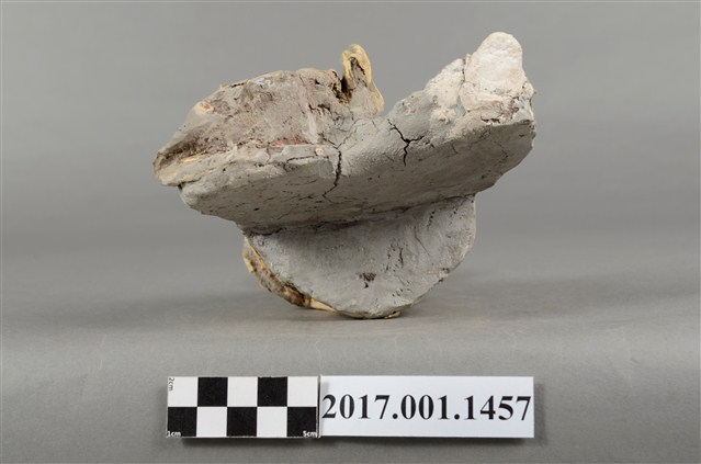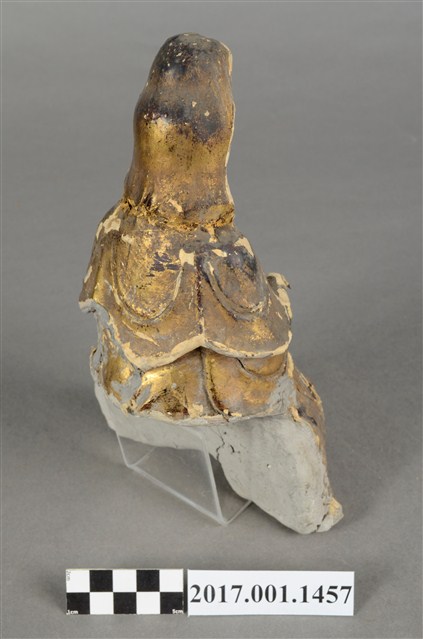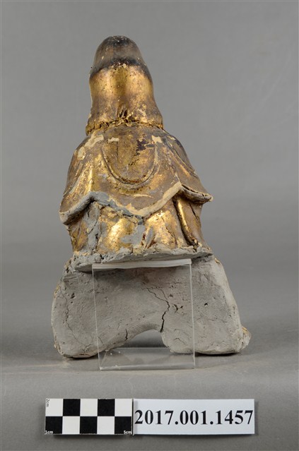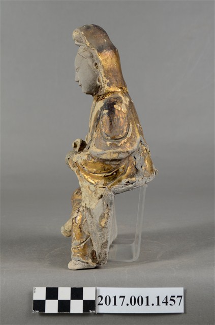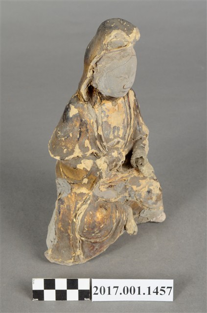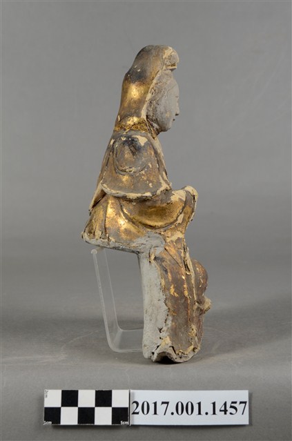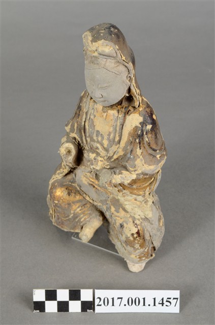 1.本件觀世音菩薩像採坐姿造形,以泥塑技法為基礎製作後,在表面裱以紗布並施黃色漆而成,粧佛脫落斑駁,露出泥土本色,底部現出泥團。菩薩採自在坐姿態,神情莊嚴,頭披風帽,身穿軟袍披肩,裝束樸素。跣足,但臺座已失,故底部呈現L形,無法豎立,必須另加支撐點。觀世音菩薩左腿自然垂地;右腿向內彎曲,平放於椅面上,右腳掌自然垂下。兩手手肘微彎,雙手手掌缺失,未知是否有持物。