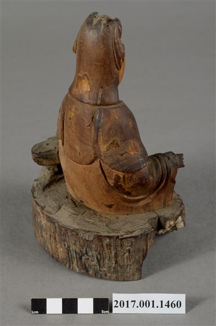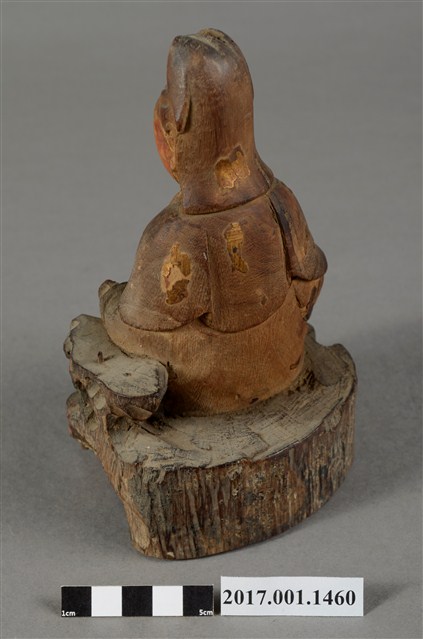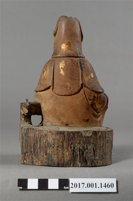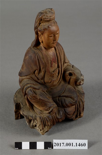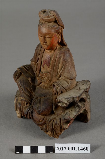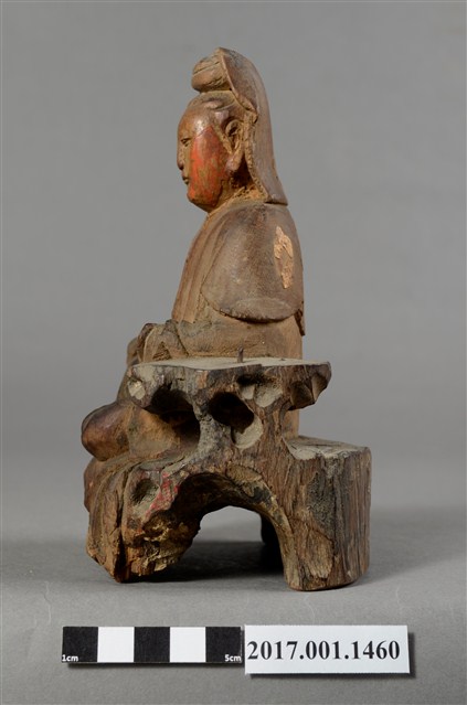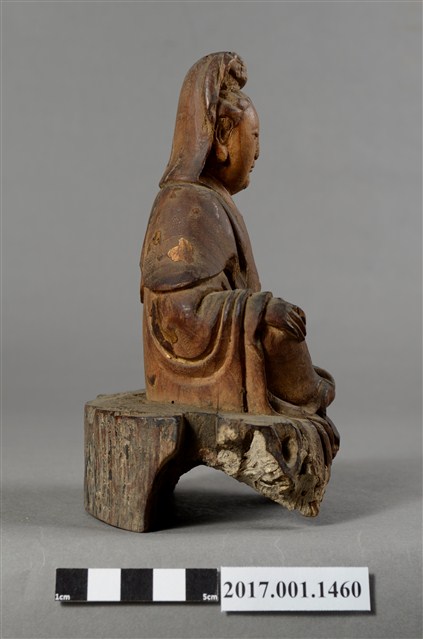 1.本件觀世音菩薩像採坐姿造形,以木雕方式製作,表面粧佛已脫落。觀世音菩薩臉孔娟秀,神情莊嚴,頭披風帽,身穿軟袍披肩,裝束樸素。菩薩採遊戲坐姿態,跣足,坐於岩座上,岩座間挖空,岩座凹陷。菩薩左腿內彎,平放於座面上;右腿屈膝小腿微側斜立於前,腳掌已缺損。右手手肘彎曲傍著右腿,安放於右膝上;左手手肘彎曲,靠著左腰部的一連座岩石上,左手掌缺損。