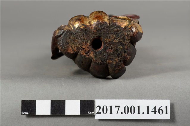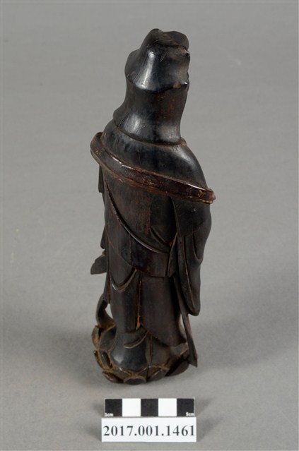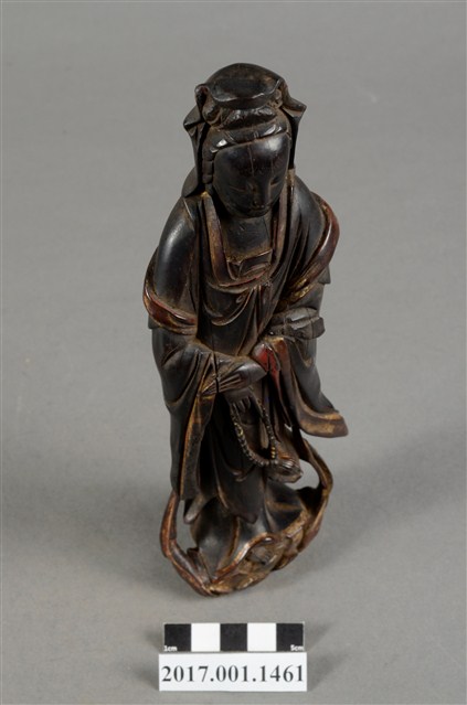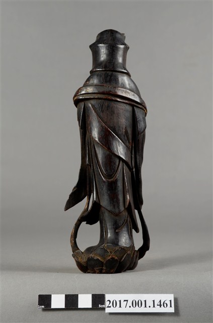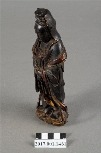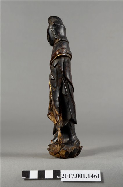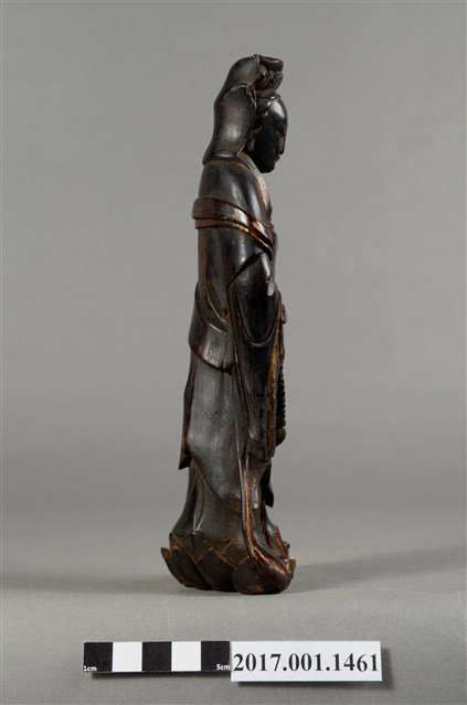 1.本件觀世音菩薩像採立姿造形,以木雕方式製作,有安金,表面粧佛已脫落。觀世音菩薩跣足立於一朵蓮座上面,蓮座有安金,象徵清淨無染,蓮座底部中間有一小圓洞。觀世音菩薩右手下垂,持一長串念珠垂於腹部前,左手安放在右手背前。觀世音菩薩頭披風帽、身穿長袍,背部披有一條長飄帶,自手肘處垂於身體兩側,長及足下蓮座。