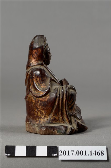 1.本件觀世音菩薩像採坐姿造形,以木雕方式製作,上有安金。觀世音菩薩神情肅穆,頭披風帽,身穿軟袍披肩,裝束樸素。菩薩採遊戲坐姿態,跣足,坐於一圓形蒲團上。臺座平整,中間有一小圓洞。菩薩左腿內彎,平放於蒲團上;右腿屈膝小腿微側斜立於前。右手手肘彎曲傍著右腿,安放於右膝上;左手手肘彎曲,伸往前方,左手手掌缺損。