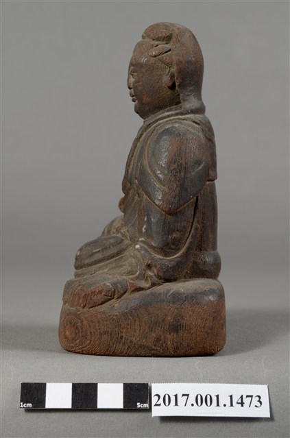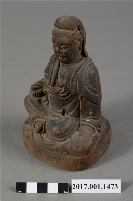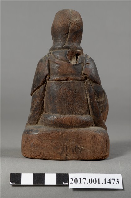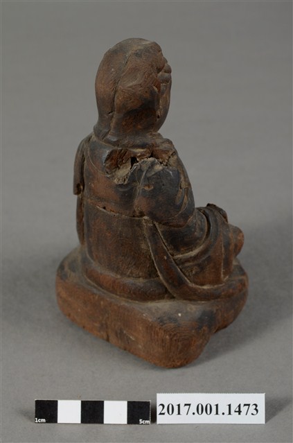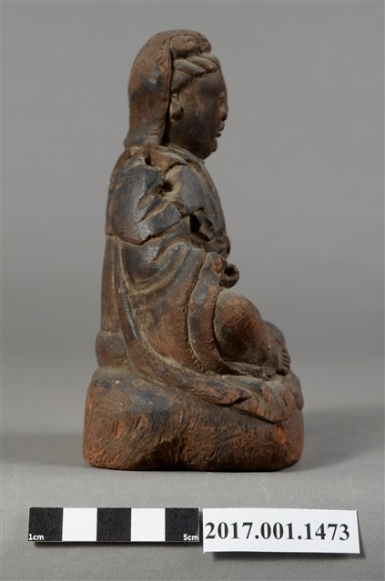 1.本件觀世音菩薩像採坐姿造形,以木雕方式製作,表面粧佛已脫落。觀世音菩薩臉孔圓潤,略帶微笑,頭披風帽,身穿軟袍披肩,裝束樸素,雕工樸拙。菩薩採遊戲坐姿態,跣足,坐於一低矮臺座上,臺座平整。菩薩左腿內彎,平放於臺座上;右腿屈膝小腿微側斜立於前。右手手肘彎曲傍著右腿,右手上仰作握物狀,持物已佚失;左手手臂自然垂地,撐在矮臺座上。觀世音菩薩右後肩破損,露出一凹洞。