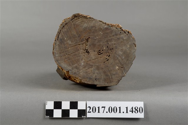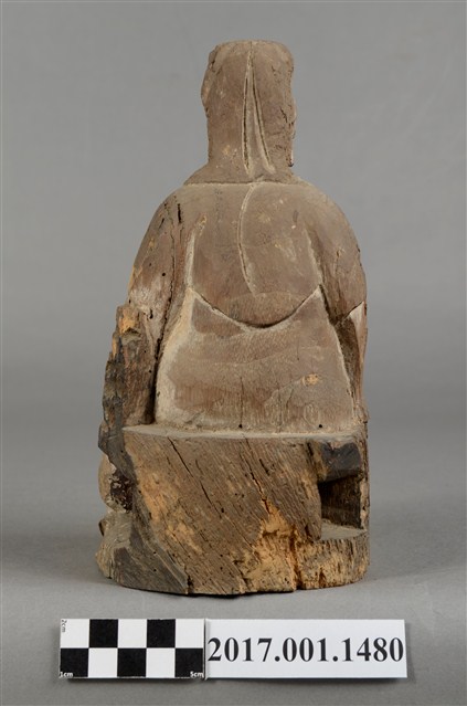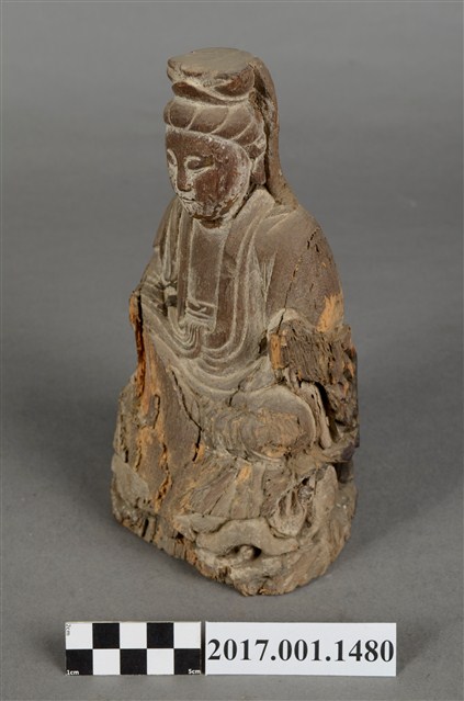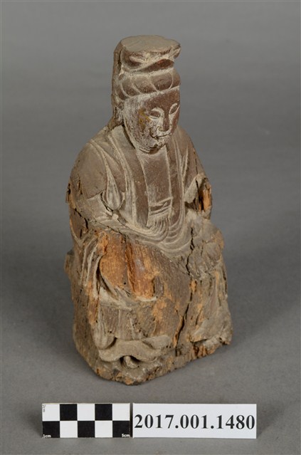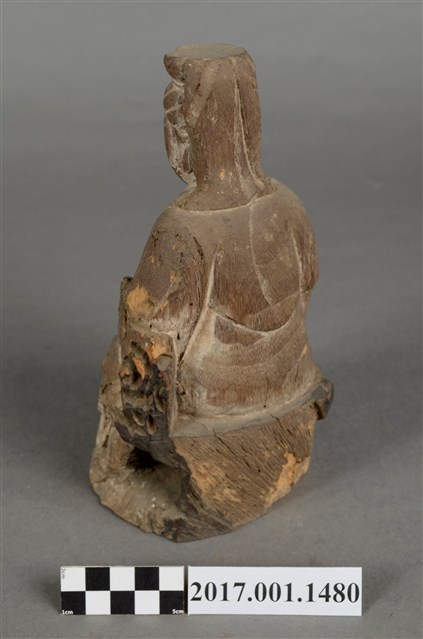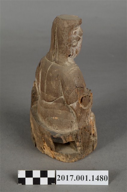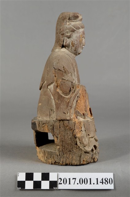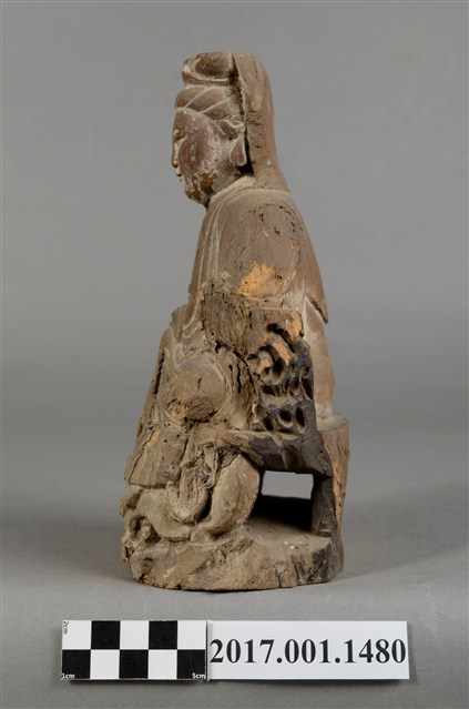 1.本件觀世音菩薩像採坐姿造形,以木雕方式製作,表面粧佛已脫落。觀世音菩薩臉孔圓潤,頭披風帽,身穿軟袍披肩,雕工樸拙。菩薩坐於一圓形臺座上,本件臺座中間有部分鏤空,底部雕刻平整。菩薩作遊戲坐姿態,跣足,左腿內彎平貼於座面上,右腿膝蓋以下連臺座垂直面部分有缺損。右手微彎,手掌部分缺損;左手手肘以下亦缺損。