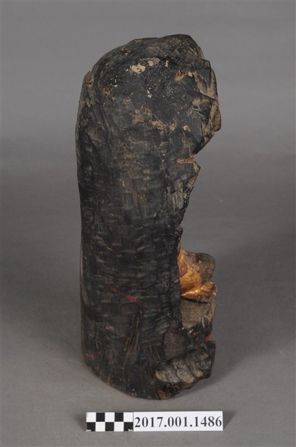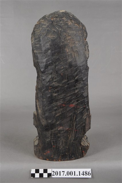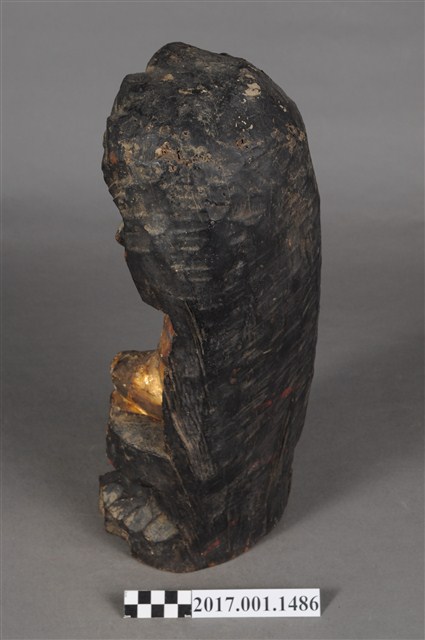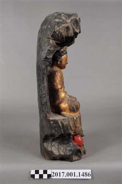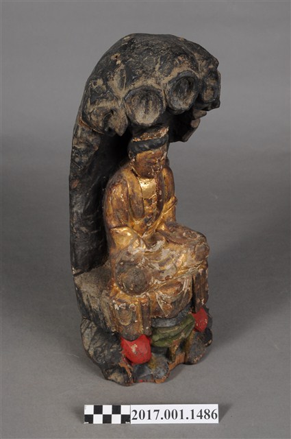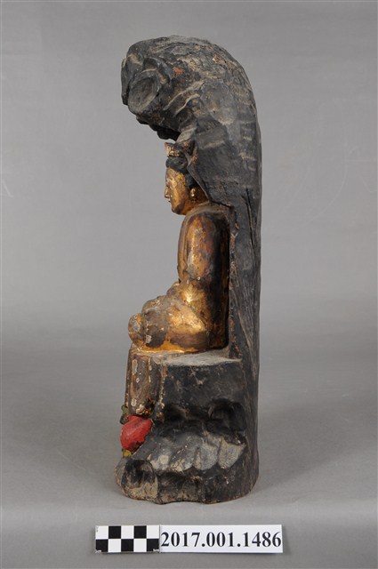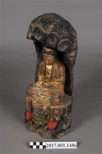 1.本件觀世音菩薩像採坐姿造形,以木雕方式製作,上有安金與彩繪,表面粧佛已部分脫落。菩薩頭頂上方與背面有一連頂及座的普陀巖。觀世音菩薩臉孔清秀,頭披風帽,身穿軟袍披肩。菩薩坐於岩座上,岩座前雕有蓮莖、蓮葉與簡單蓮花,上面有紅色、綠色、藍色的彩繪,岩座底部雕刻較平整。菩薩作結跏趺坐姿態,雙腿雙盤交錯相疊,足部隱於袍服之內。雙手手肘微彎,雙手上仰相疊,右手掌在上,結禪定印,安放於雙盤腿上。