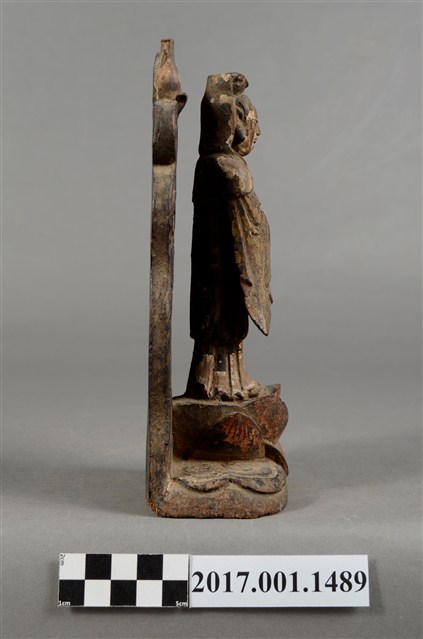 1.本件觀世音菩薩像採立姿造形,以木雕方式製作,表面粧佛已脫落。菩薩背面有一座刻有捲草紋的普陀巖,本件底部雕刻平整,略有蛀蝕現象,山巖背後上方稍有缺損。觀世音菩薩作立姿姿態,跣足,站立一蓮座上,蓮座有象徵菩薩清淨無染之意。觀世音菩薩臉孔清秀,頭披風帽,身穿軟袍披肩。左手自然放下,手掌朝前;右手微彎,兜住左手的衣袖。觀世音菩薩左肩後方普陀巖上立一隻鸚鵡;右肩後方普陀巖上則置一只淨瓶。