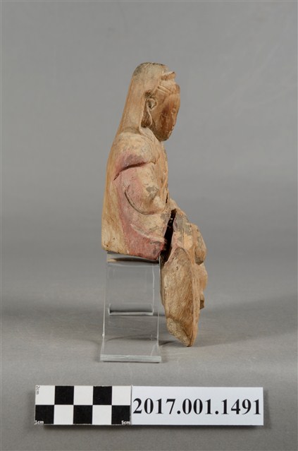 1.本件觀世音菩薩像像採坐姿造形,以木雕方式製作,表面粧佛已脫落,背部有一長方形入神洞,封榫完好。觀世音菩薩臉孔娟秀,頭披風帽,身穿長袍披肩,有瓔珞裝飾。菩薩採結跏趺坐姿態,座下有座具垂巾,前面臺座成M字狀,由底下俯瞰呈L狀,底部左側有長裂紋,原先可分離的臺座已佚失。菩薩作雙盤的結跏趺坐姿態,雙腳相交疊,足部隱於袍服之內。雙手手肘微彎,手掌上仰相疊,右手掌在上,結禪定印,安放於雙腿上。