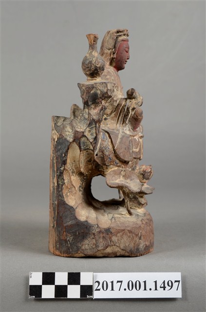 1.本件觀世音菩薩像採坐姿造形,以木雕方式製作,表面粧佛已脫落。岩座鏤空,岩座前面中央有一朵蓮花,左右各刻一株帶葉蓮莖,底部平整,背後有一樹瘤之洞。觀世音菩薩臉孔娟秀,頭披風帽,身穿軟袍披肩。菩薩作遊戲坐姿態,跣足,左腿內彎平貼於岩座上,右腿屈膝小腿斜立,右手微彎手持一經卷;左手垂直放下手掌觸岩座。菩薩身右立一案几,案上置一只淨瓶;菩薩身左有一連座臺子,臺子上端缺損。