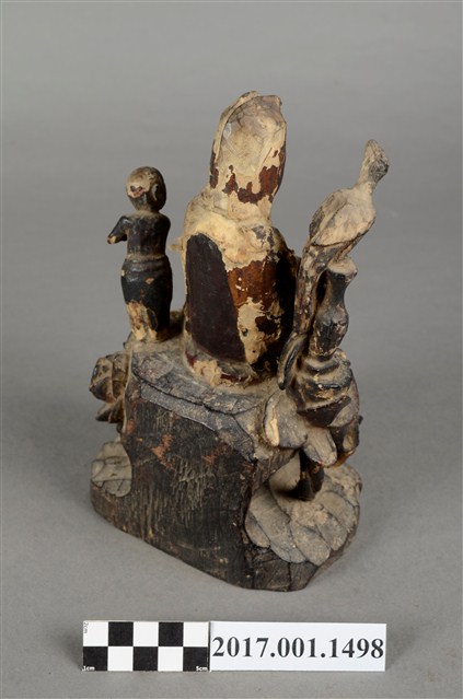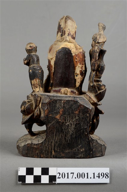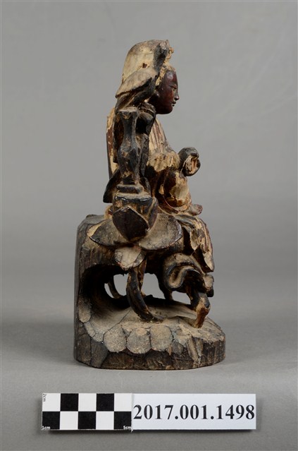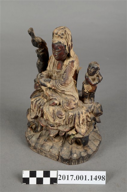 1.本件觀世音菩薩像採坐姿造形,以木雕方式製作,表面粧佛已脫落。岩座鏤空,雕數朵蓮花與蓮莖,岩座中央有一朵蓮花,象徵菩薩清靜無染如蓮。底部平整,但有一道長裂紋。觀世音菩薩臉孔娟秀,頭披風帽,身穿軟袍披肩。菩薩作遊戲坐姿態,跣足,左腿內彎平貼於岩座上,右腿屈膝小腿斜立於前,右手微彎橫過腰部,與左手合捧一經卷。身左立一善財童子做合掌膜拜狀;身右案上置一只淨瓶,瓶上立一隻鸚鵡。