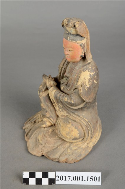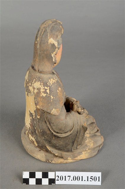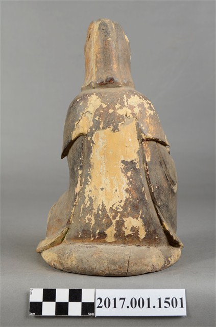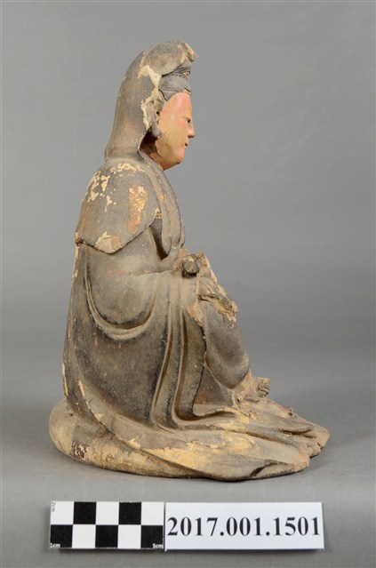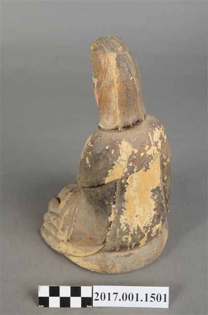 1.本件觀世音菩薩像採坐姿造形,以木雕方式製作,表面粧佛已脫落。觀世音菩薩臉孔清秀眉宇細緻,頭披風帽,身穿軟袍披肩。菩薩作遊戲坐姿態,臀下有一蒲團,跣足,左腿內彎平貼於蒲團上,右腿屈膝小腿微微斜立於前。右手微彎手掌輕貼於右膝上;左手手肘微彎橫於胸前,握一經卷。