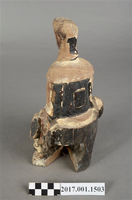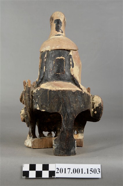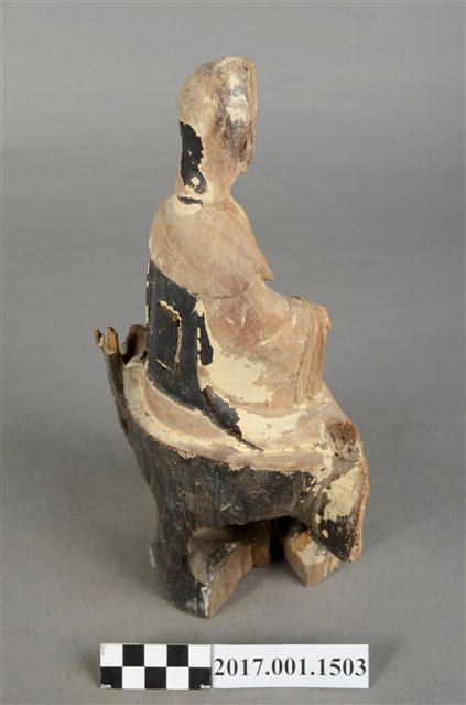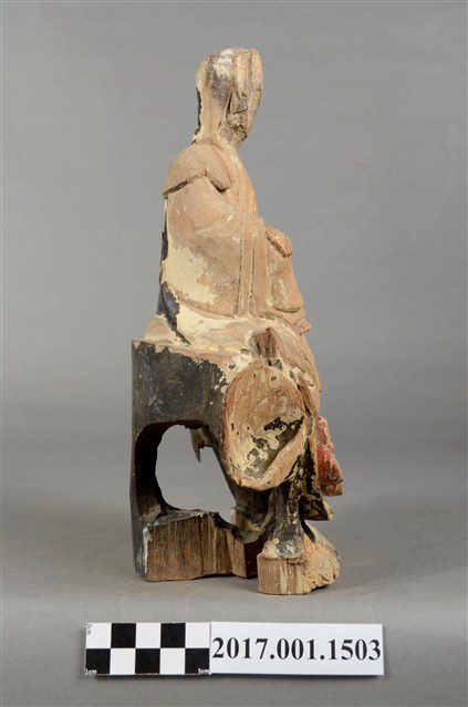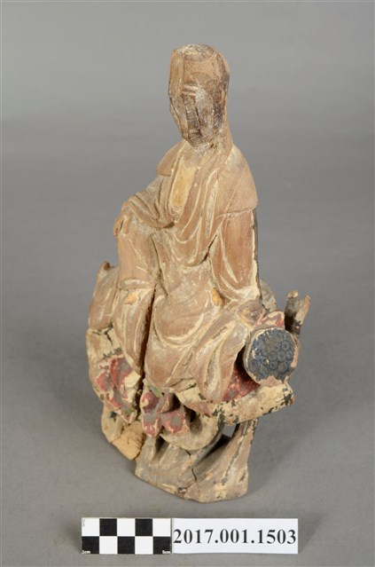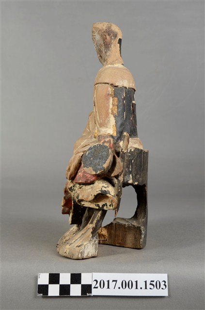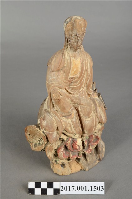 1.本件觀世音菩薩像採坐姿造形,以木雕方式製作,表面粧佛已脫落。背後有一長方形入神洞,封榫完好。菩薩底下有一挑高挖空的岩座,岩座不規則狀,並有鐵釘修補現象。岩座中央有一紅色大蓮花,有清淨無染之意。觀世音菩薩臉孔磨損,但仍可看出頭披風帽,身穿軟袍披肩。菩薩作遊戲坐姿態,跣足,坐於岩座上。左腿內彎平貼於椅面上,右腿屈膝小腿斜立於前。左手自然放下撐住座面;右手手肘微彎,手掌輕靠於右膝上。本件正面中間自右腳掌以下及至岩座蓮花處,有一道垂直長裂紋。