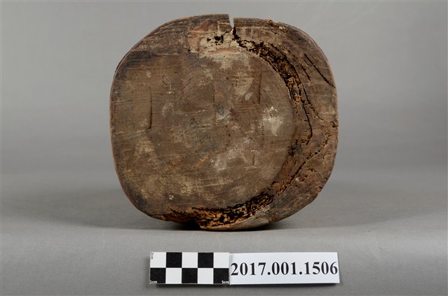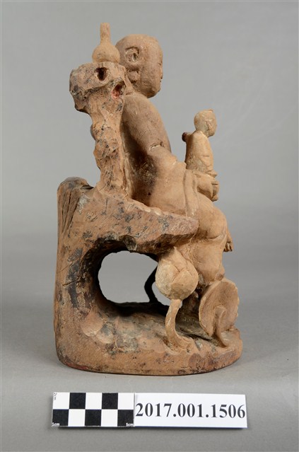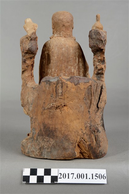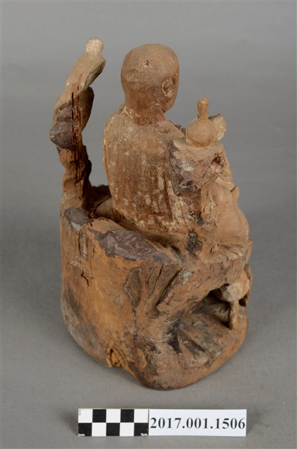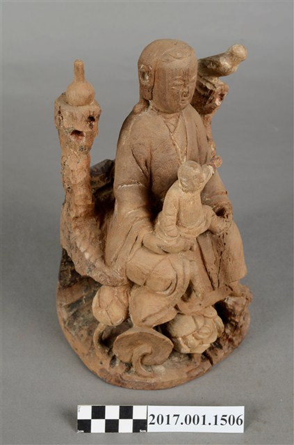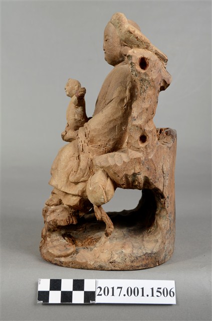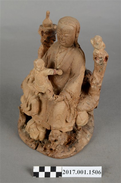 1.本件觀世音菩薩像採坐姿,作送子觀世音菩薩造形,以木雕方式製作,表面粧佛已脫落。菩薩座下有一鏤空岩座,中間雕有蓮花,兩旁又有帶莖的蓮苞和蓮葉,底部平整,有蛀蝕現象與圓弧形長裂紋。觀世音菩薩臉孔娟秀,髮往後梳,分兩垂髻,身穿軟袍披肩。菩薩作自在坐姿態,跣足,左腿自然垂地,踏於岩石上;右腿屈膝平貼於座面上,腳掌自然垂於椅前。菩薩右手手肘微彎,抱一小兒,小兒則安坐菩薩右腿上;菩薩左手手肘微彎,手掌托住小兒的左腳。菩薩身左有一連接山巖的臺子,上立一隻鸚鵡;身右連接普陀巖臺上則置一只淨瓶。
